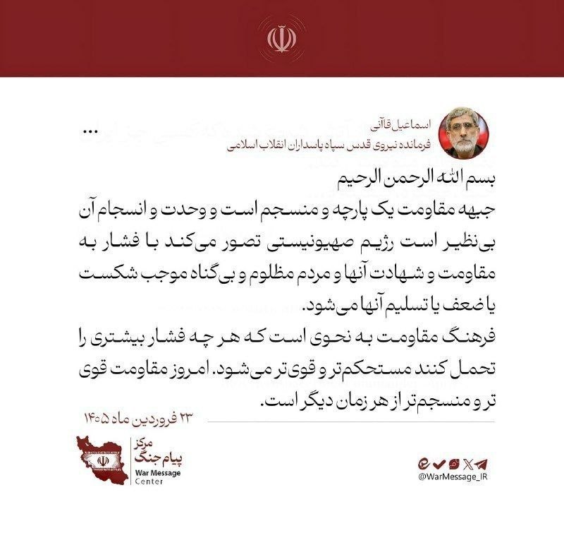 قآاني: إن جبهة المقاومة موحدة ومتماسكة