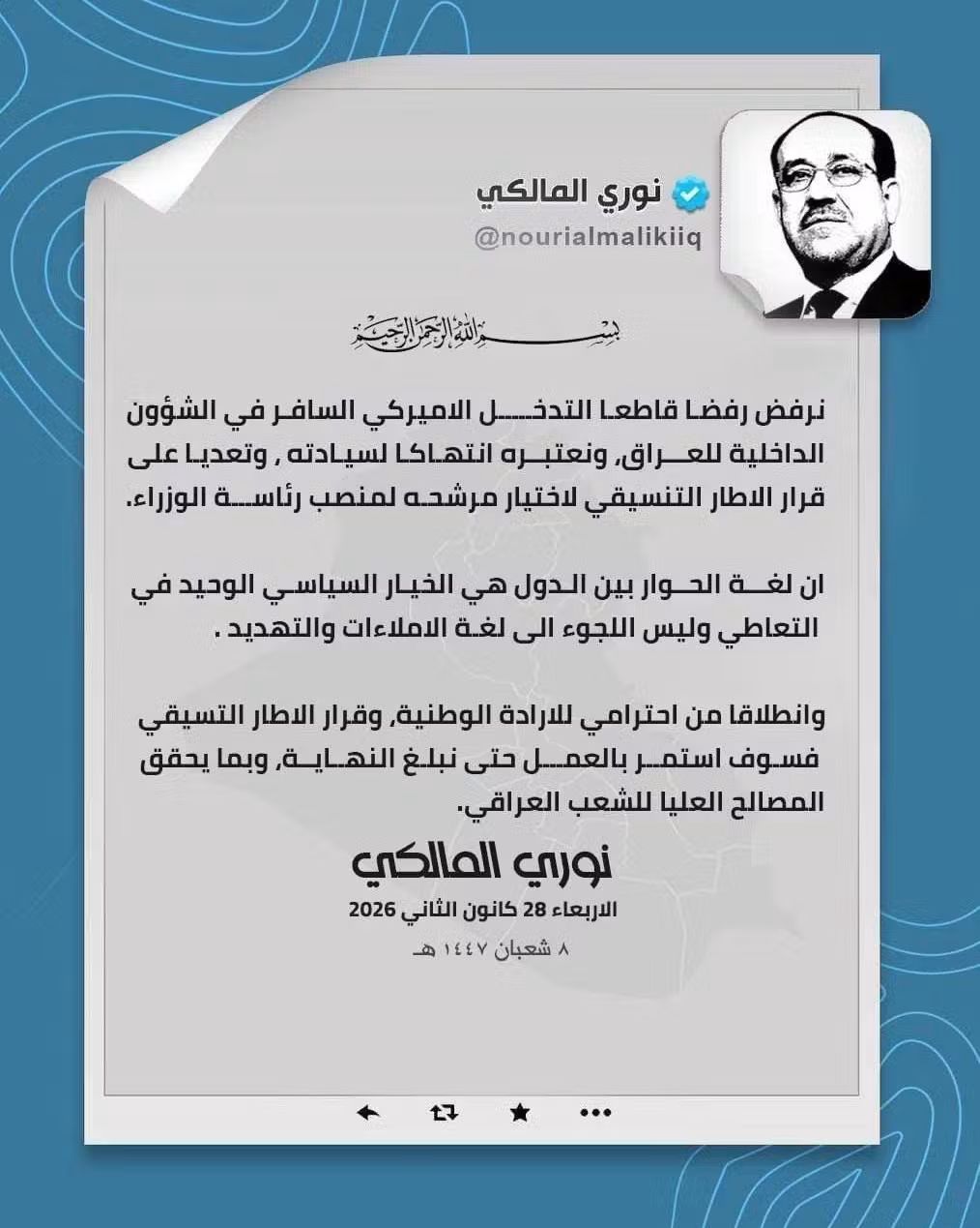 الموقع الرسمي ل/كتائب سيد الشهداء/أكد حزب الدعوة الإسلامية، اليوم الأربعاء، أن نوري المالكي يُعد شخصية وطنية بارزة تحمّلت مسؤوليات كبيرة خلال...
