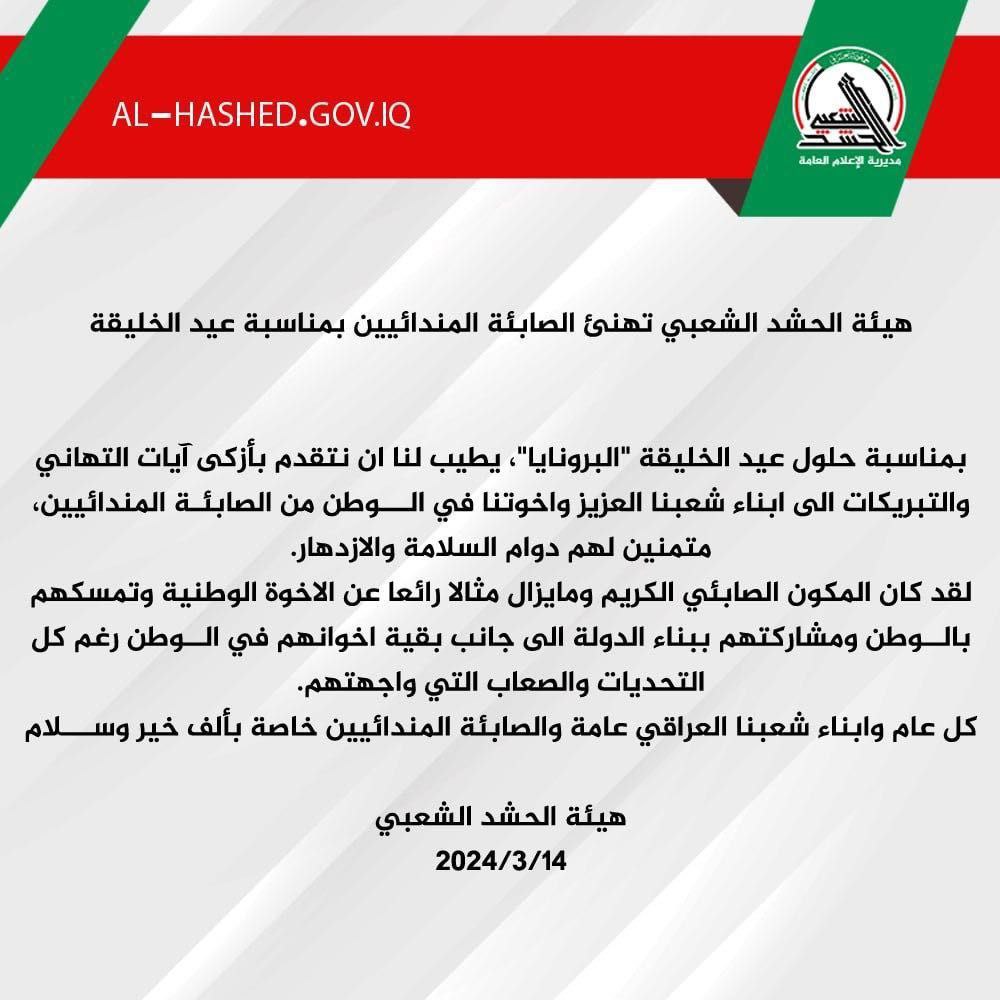 الموقع الرسمي ل/كتائب سيد الشهداء/ بمناسبة حلول عيد الخليقة "البرونايا"، يطيب لنا ان نتقدم بأزكى آيات التهاني والتبريكات الى ابناء شعبنا العزيز...