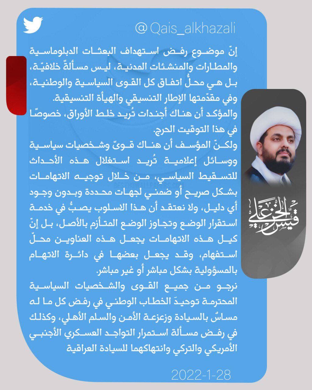 وقال في تغريدة على منصة تويتر تابعها الموقع الرسمي لـ/كتائب سيد الشهداء/ ما نصه “ان موضوع رفض استهداف البعثات الدبلوماسية والمطارات والمنشئات المدنية ليس مسألة خلافية بل هي محل اتفاق كل القوى السياسية والوطنية وفي مقدمتها الاطار التنسيقي والهيأة التنسيقية.