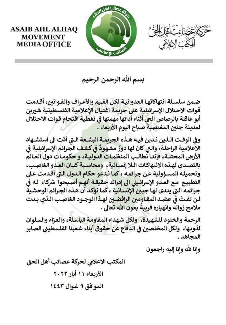 بيان المكتب الاعلامي لحركة عصائب اهل الحق بشأن اغتيال الصحافية شيرين ابو عاقلة