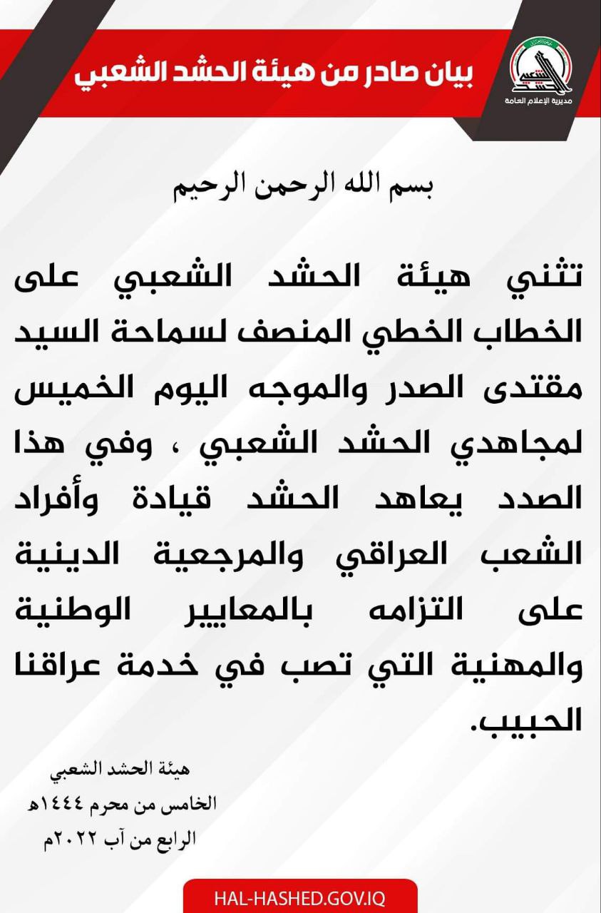 تثني هيئة الحشد الشعبي على الخطاب الخطي المنصف لسماحة السيد مقتدى الصدر والموجه اليوم الخميس لمجاهدي الحشد الشعبي ، وفي هذا الصدد يعاهد الحشد قيادة وأفراد الشعب العراقي والمرجعية الدينية على التزامه بالمعايير الوطنية والمهنية التي تصب في خدمة عراقنا الحبيب.