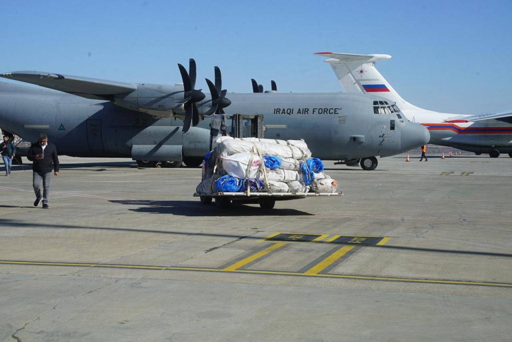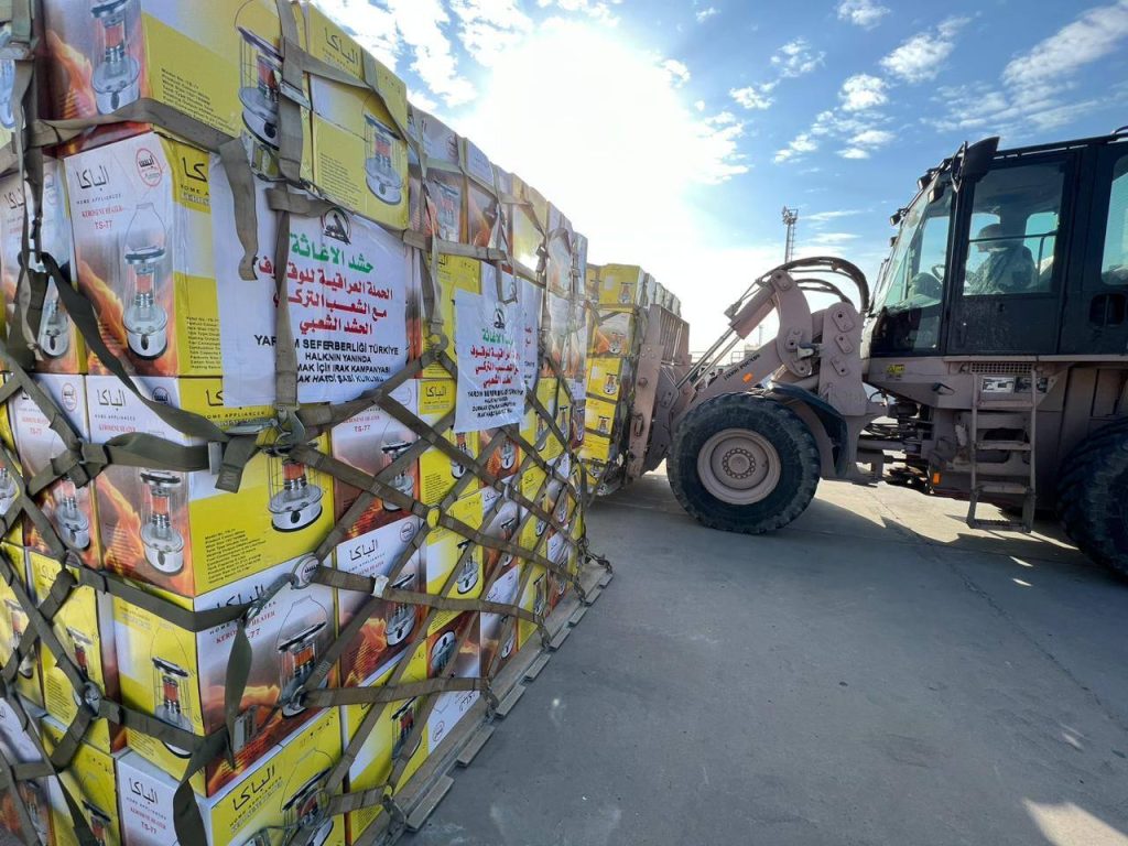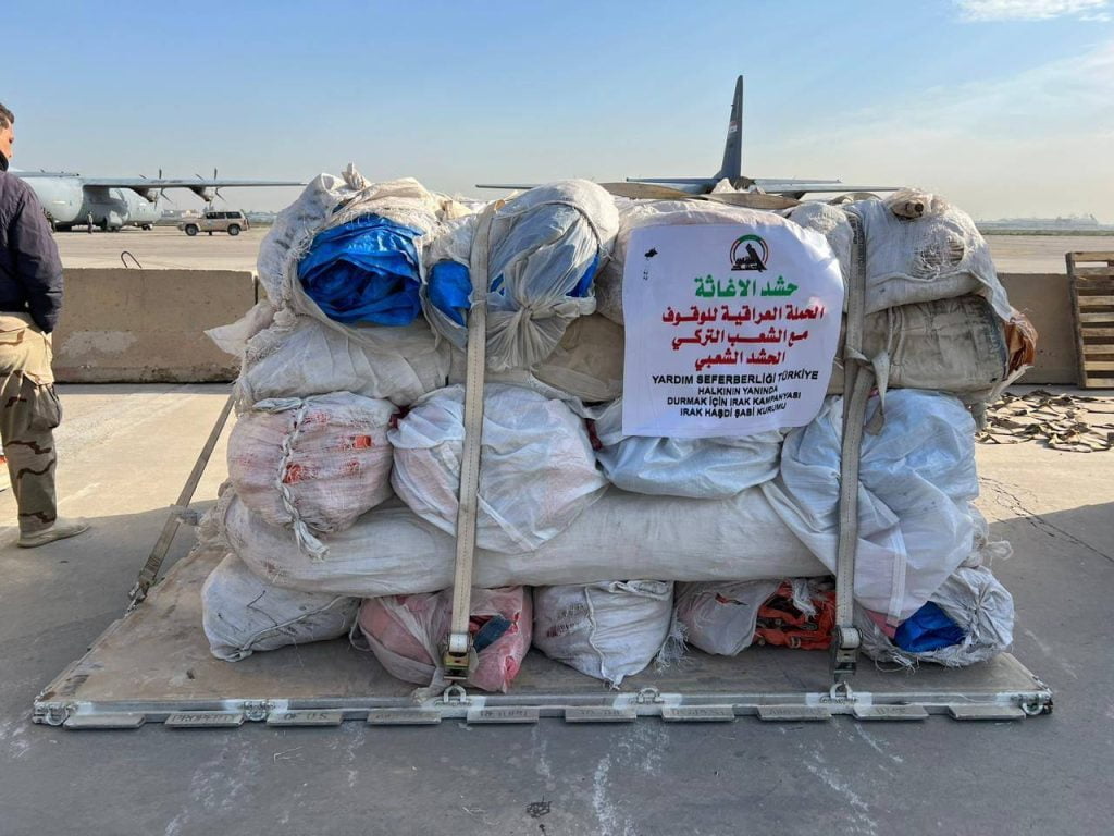 استنادا لتوجيهات السيد رئيس الوزراء محمد شياع السوداني ودعم السيد رئيس هيئة الحشد الشعبي فالح الفياض، جهزت هيئة الحشد الشعبي ٤ طائرات بحمولة ٤٠ طنا لكل واحده منها، محملة بالمواد والمستلزمات كهدية الى الشعب التركي المتضرر جراء الزلزال الأخيرة.وتحتوي حمولات الطائرات على اعداد كبيرة من المفروشات ووسائل التدفئة والخيم العائلية.وهبطت طائرتان، صباح اليوم الثلاثاء، في مطار غازي عنتاب الدولي، فيما تستعد الطائرتان للهبوط يوم غد بمشيئة الله تعالى.وتأتي هذه المساعدات ضمن حملة اغاثية كبرى أطلقها العراق من أجل مساعدة إخوانه المتضررين من الزلزال الأخير في سوريا وتركيا والوقوف معهم حتى تجاوز محنتهم كجزء من الالتزامات الإنسانية للعراق الذي لن يتخلى عن الأصدقاء والاشقاء في أزماتهم.