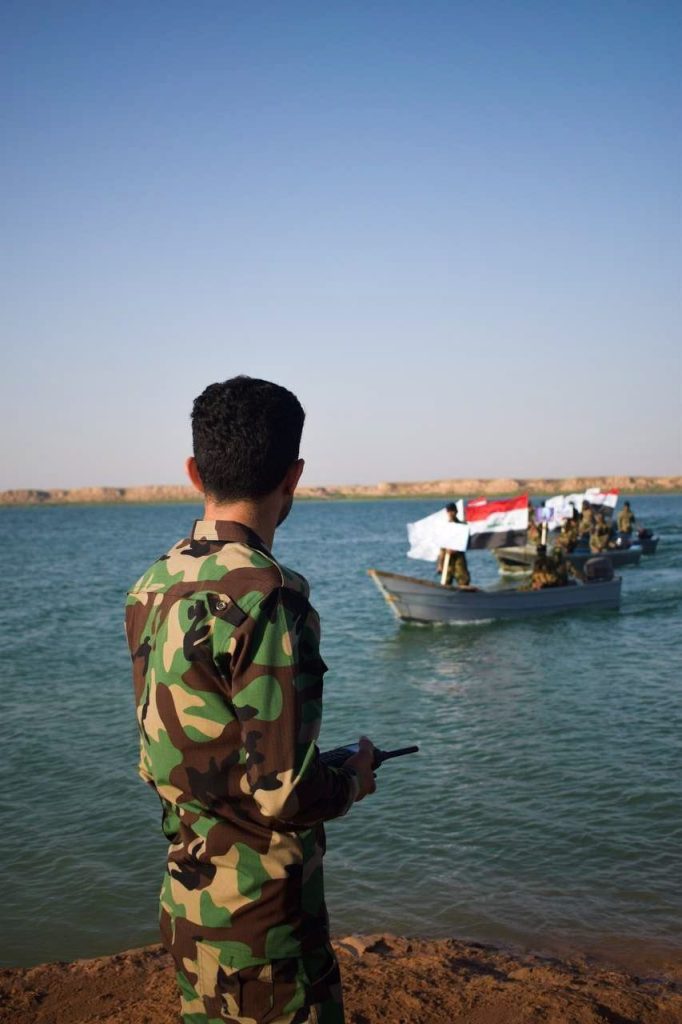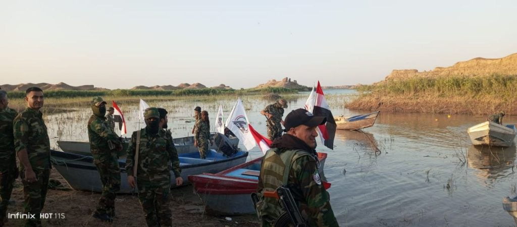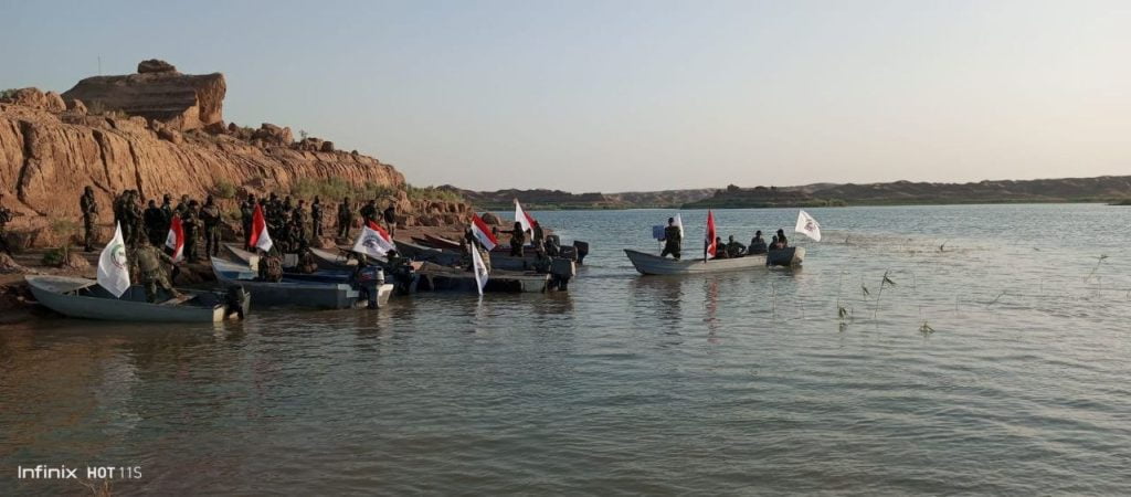 أجرى اللواء 63 التابع الى قيادة عمليات محور الشمال بالحشد الشعبي، السبت، مناورات وتدريبات بحرية في بحيرة آمرلي بالتزامن مع الذكرى التاسعة لتأسيس الحشد الشعبي.