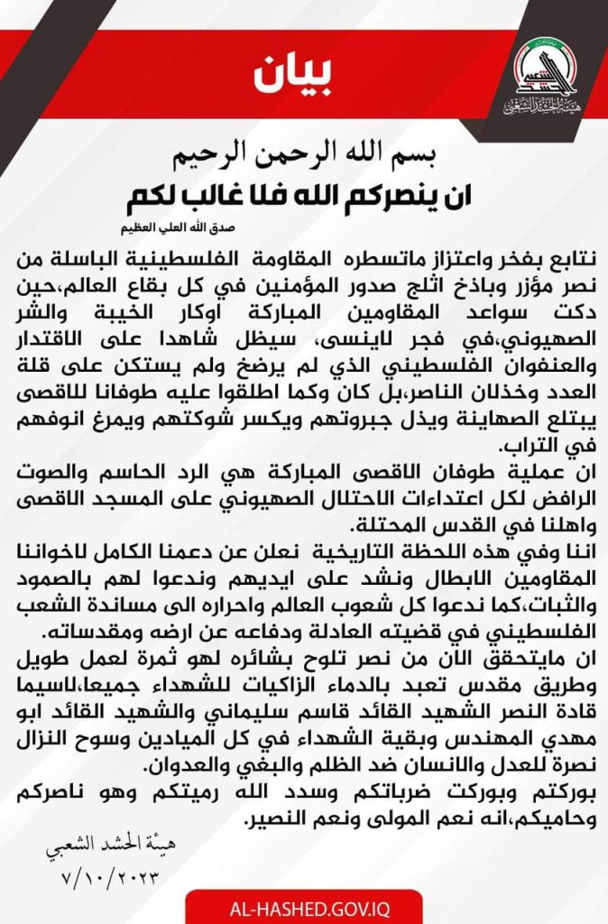 بيان 📍 هيئة الحشد الشعبي: عملية طوفان الأقصى المباركة هي الرد الحاسم والصوت الرافض لكل اعتداءات الاحتلال الصهيوني