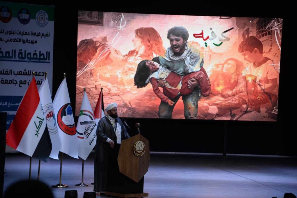 وتناول المهرجان فعاليات متعددة ادانت الانتهاكات الصهيونية بحق الشعب الفلسطيني، داعين شعوب العالم للتحرك ووقف المجازر الوحشية التي يتعرض لها الشعب الفلسطيني. وتناول ايضا عرض فيلم بعنوان (كوفية) انتجه قسم الاعلام في قيادة عمليات نينوى للحشد الشعبي بالاشتراك مع كلية الفراهيدي وكلية الفنون يصور واقعة مظلومية الشعب الفلسطيني المظلوم .