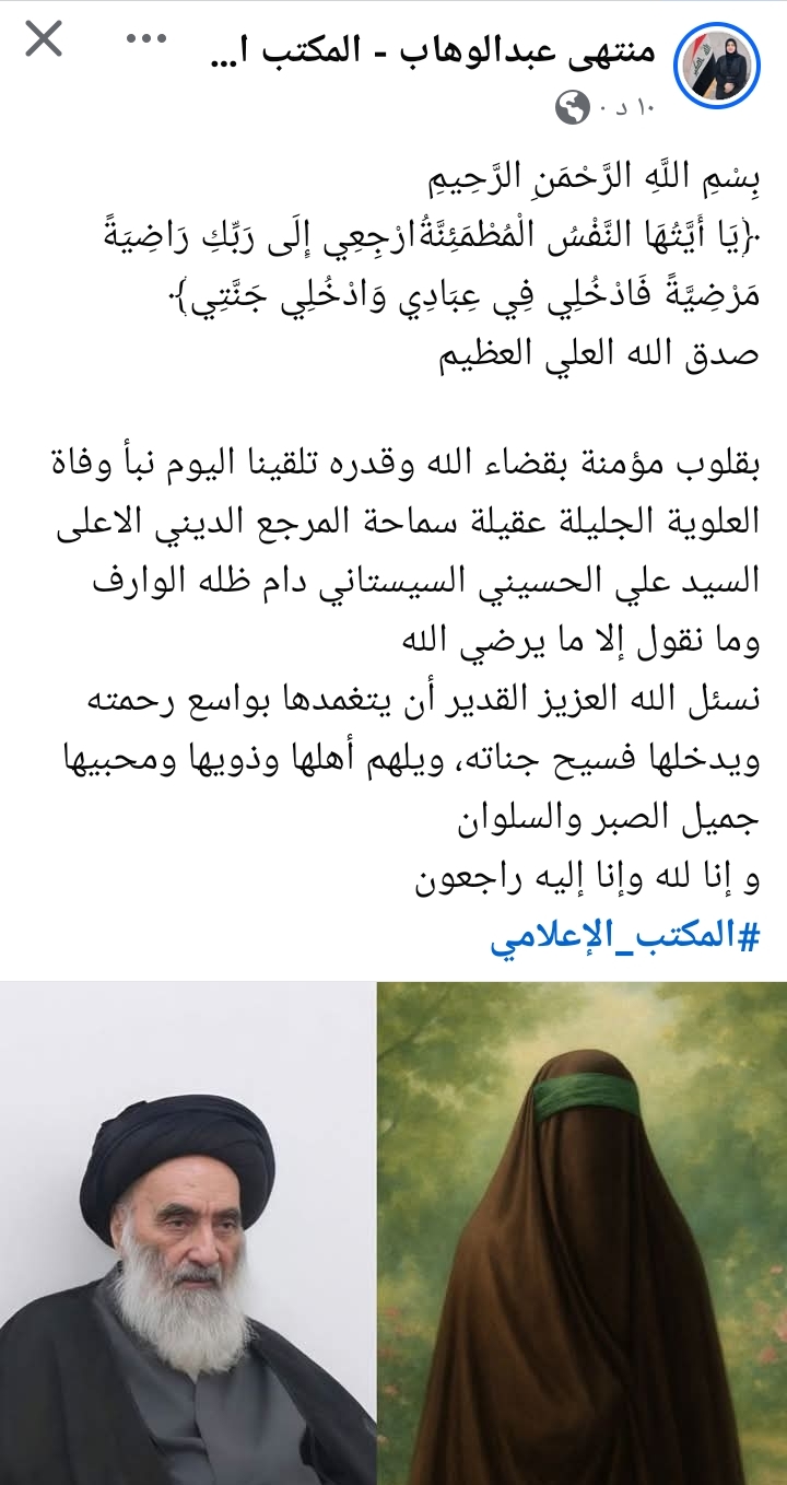بقلوب مؤمنة بقضاء الله وقدره تلقينا اليوم نبأ وفاة العلوية الجليلة عقيلة سماحة المرجع الديني الاعلى السيد علي الحسيني السيستاني دام ظله الوارف