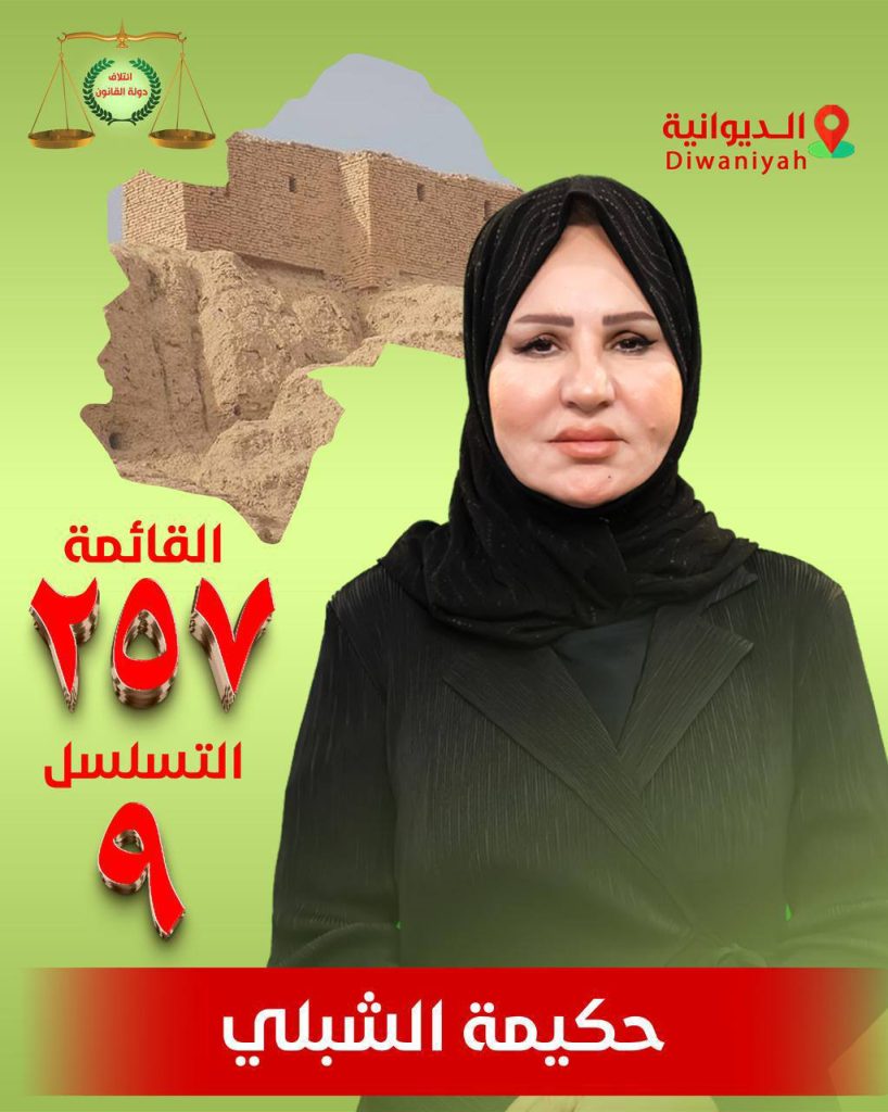 توكلنا على الله ..المرشحة عن ائتلاف دولة القانونالمحامية حكيمة الشبلاويرقم القائمة ٢٥٧تسلسل ١٩محافظة الديوانية
