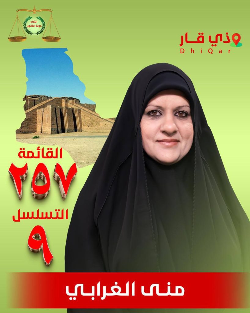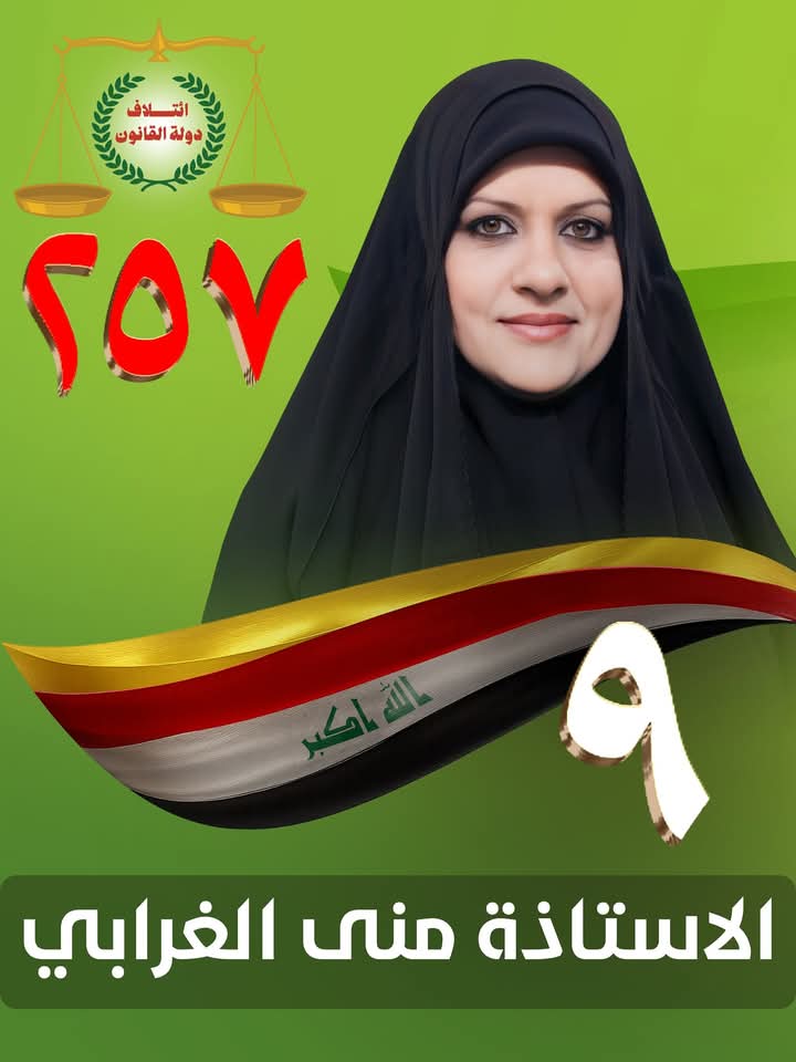 توكلنا على الله ..المرشحة عن ائتلاف دولة القانونالاستاذة منى الغرابيرقم القائمة ٢٥٧تسلسل ٩محافظة ذي قار