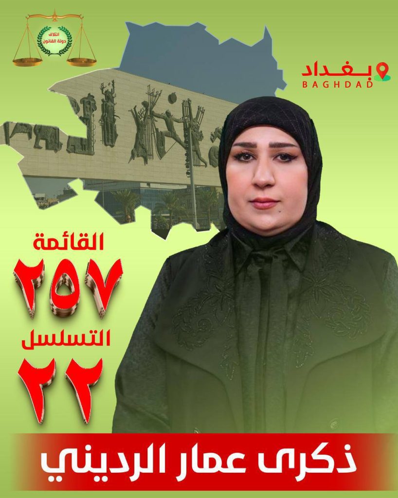 توكلنا على الله ..المرشحة عن ائتلاف دولة القانونالاستاذة ذكرى الردينيرقم القائمة ٢٥٧تسلسل ٢٢محافظة بغداد