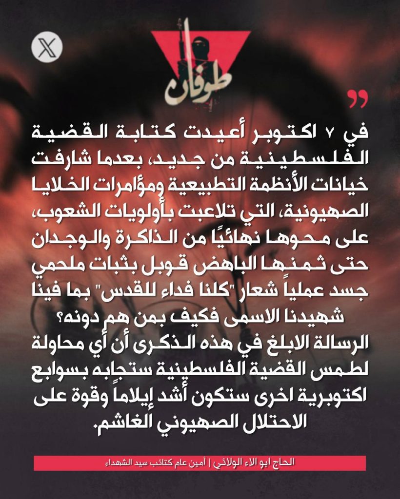 الحاج ابو الاء الولائي في ذكرى ال٧ من أكتوبر: اي محاولة لطمس القضية الفلسطينية ستجابه بسوابع اكتوبرية اخرى ستكون أشد إيلاماً وقوة على الاحتلال الصهيوني الغاشم