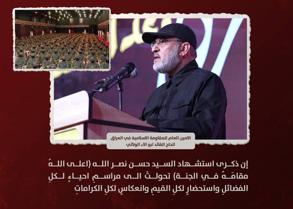 الحاج ابو الاء الولائي: إن ذكرى استشهاد السيد حسن نصر الله (اعلى اللهُ مقامَهُ في الجنة) تحولتْ الى مراسمِ احياءٍ لكلِ الفضائلِ واستحضارٍ لكلِ القيمِ وانعكاسٍ لكلِ الكراماتِ.