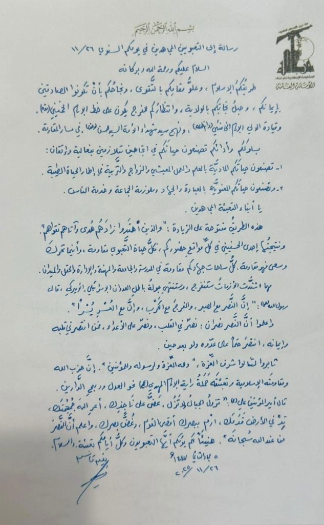 طريقكم الإسلام، وعلوّ مقامكم بالتقوى، ونجاحكم بأن تكونوا الصادقين بإيمانكم، وحبلُ نجاتكم بالولاية، وانتظاركم الفرج يكون على خط الإمام الخميني (قده)، وقيادة الولي الإمام الخامنئي (دام ظله)، ونهج سيد شهداء الأمة السيد حسن (رض) في مسار المقاومة.