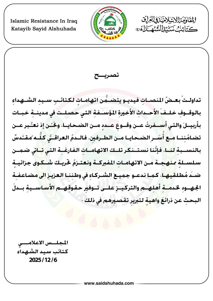 تداولتْ بعضُ المنصاتِ فيديو يتضمّنُ اتهاماتٍ لكتائبِ سيدِ الشهداءِ بالوقوفِ خلفَ الأحداثِ الأخيرةِ المؤسفةِ التي حصلت في مدينةِ خبات بأربيلَ والتي أسفرتْ عن وقوعِ عددٍ من الضحايا، ونحنُ إذ نعبّرُ عن تضامُنِنا مع أُسَرِ الضحايا من الطرفينِ، فالدمُ العراقيُّ كلُّهُ مقدَّسٌ بالنسبةِ لنا، فإنّنا نستنكرُ تلك الاتهاماتِ الفارغةِ التي تاتي ضمن سلسلةٍ ممنهجة من الاتهاماتِ المفبركة.