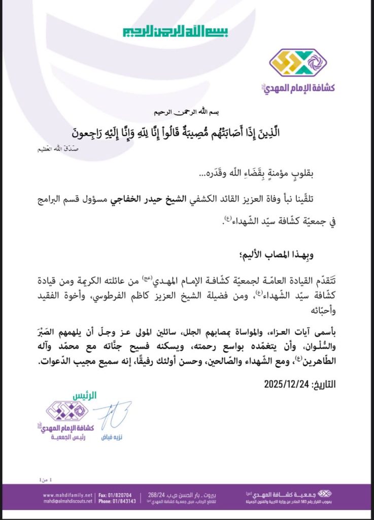 وتتوجه كشافة الإمام المهدي (عج) في العراق بجزيل الشكر والامتنان إلى جمعية كشافة الإمام المهدي (عج)في لبنان والى فضيلة الشيخ نزيه الفياض المفوض العام للجمعية، على برقية التعزية المشرفة وعلى مواساتكم لنا في هذا المصاب الأليم نسأل الله أن يحفظكم ويوفقكم لما فيه الخير.