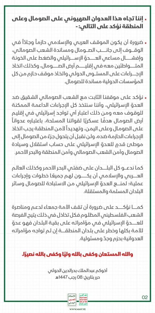 نؤكد على موقفنا الثابت مع الشعب الصومالي الشقيق ضد العدوّ الإسرائيلي، وأننا سنتخذ كل الإجراءات الداعمة الممكنة للوقوف معه ومن ذلك اعتبار أي تواجد إسرائيلي في إقليم أرض الصومال هدفًا عسكريًا لقواتنا المسلحة، باعتباره عدواناً على الصومال وعلى اليمن، وتهديداً لأمن المنطقة يجب اتخاذ الإجراءات الحازمة ضده، ولن نقبل أن يتحول جزءٌ من الصومال إلى موطئ قدمٍ للعدوّ الإسرائيلي على حساب استقلال وسيادة الصومال وأمن الشعب الصومالي وأمن المنطقة والبحر الأحمر.