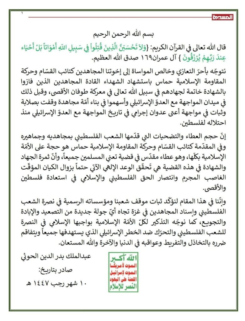 نص برقية العزاء من السيد القائد عبدالملك بدرالدين الحوثي لحركة حماس باستشهاد ثلة من قيادات كتائب القسام