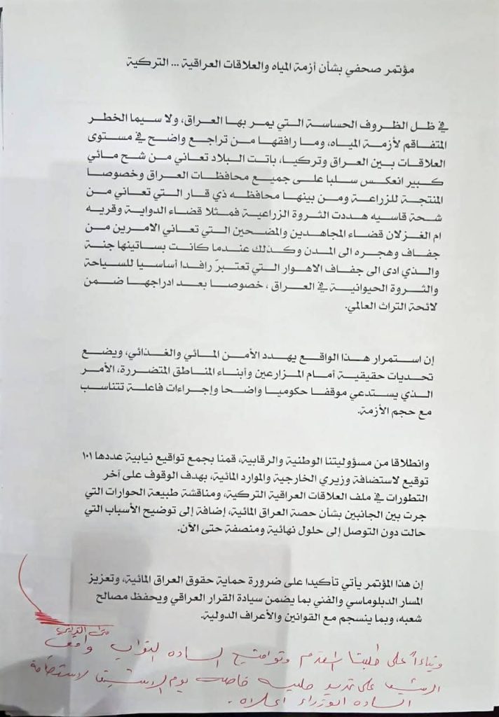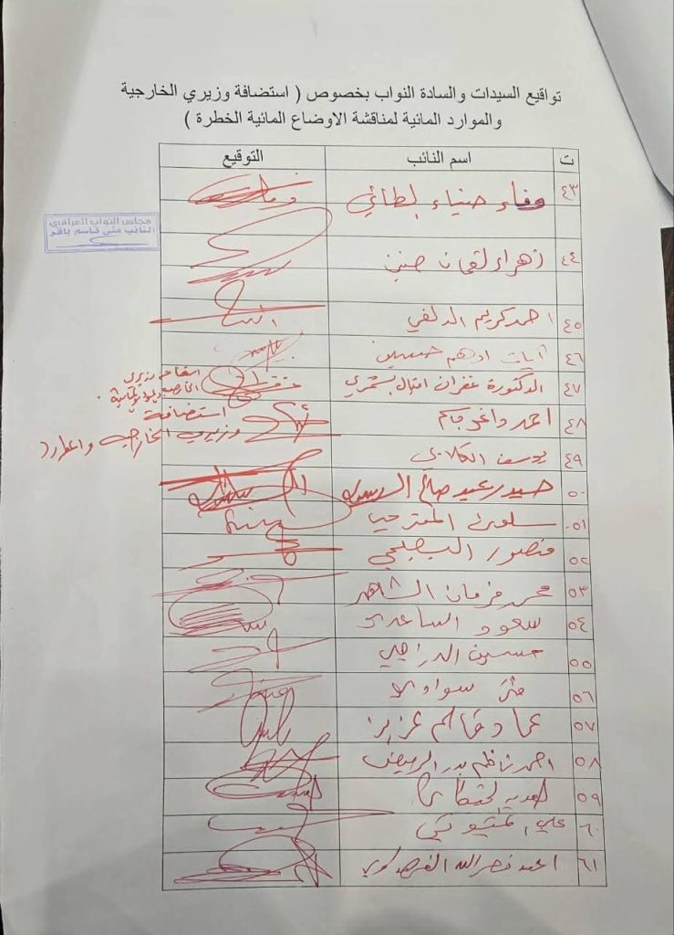 انطلاقا” من مسؤوليتنا الوطنية والرقابية قمنا بجمع تواقيع نيابية لأستضافة وزيري الخارجية والموارد المائية لمناقشة أزمة المياه في البلاد،والوقوف على اخر التطورات والحوارات في ملف العلاقات العراقية _التركيه بشأن حصة العراق المائية.