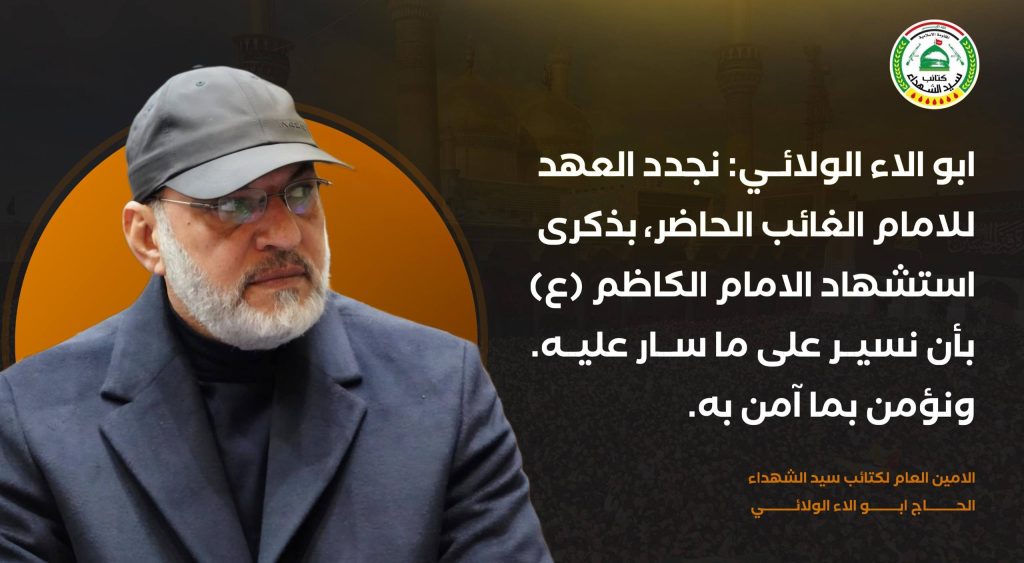 نجدد لك العهد ايها الغائب الحاضر، بذكرى استشهاد جدك صاحب السجدة الطويلة ، الامام موسى بن جعفر (عليهما السلام) بأن نسير على ما سار عليه. ونؤمن بما آمن به. فعدوّه عدوّنا ووليّه وليّنا ونهجه نهجنا ومقاومته مقاومتنا.