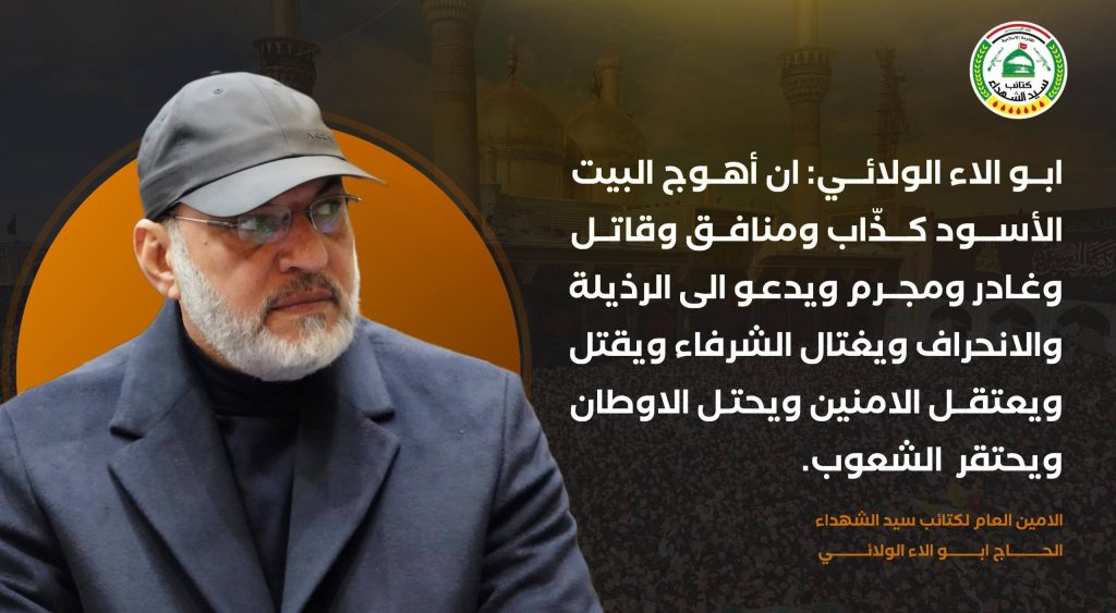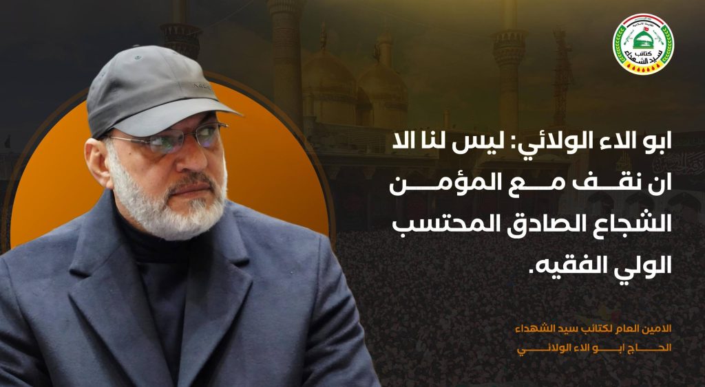 واليوم توشك المنازلة ان تقع بين معسكر الايمان ومعسكر الشرك.. ونحن ، أين نقف؟ مع مَنْ ؟ وقد علمنا ان أهوج البيت الأسود كذّاب ومنافق وقاتل وغادر ومجرم ويدعو الى الرذيلة والانحراف ويغتال الشرفاء ويقتل ويعتقل الامنين ويحتل الاوطان ويحتقر الشعوب فليس لنا الا ان نقف مع المؤمن الشجاع الصادق المحتسب الولي الفقيه.