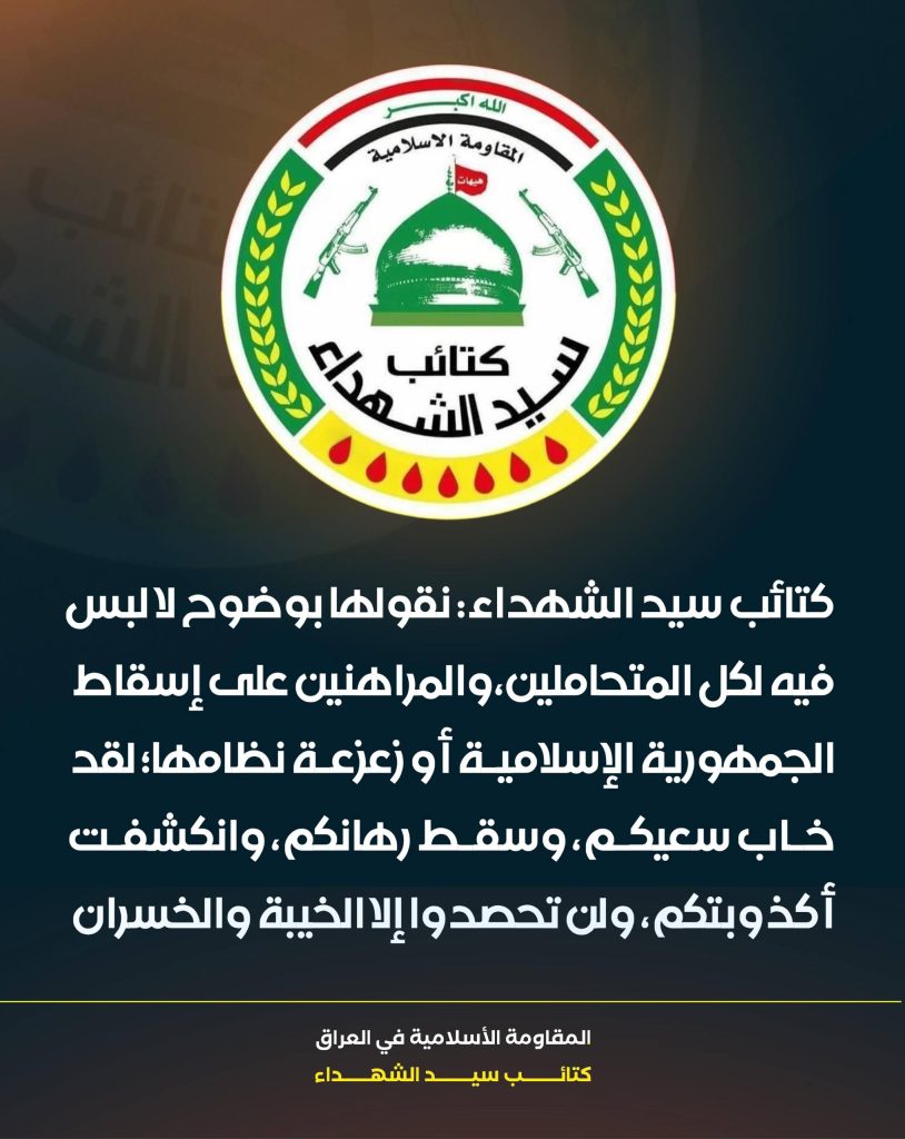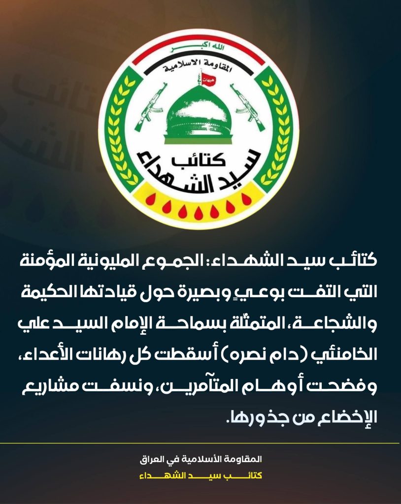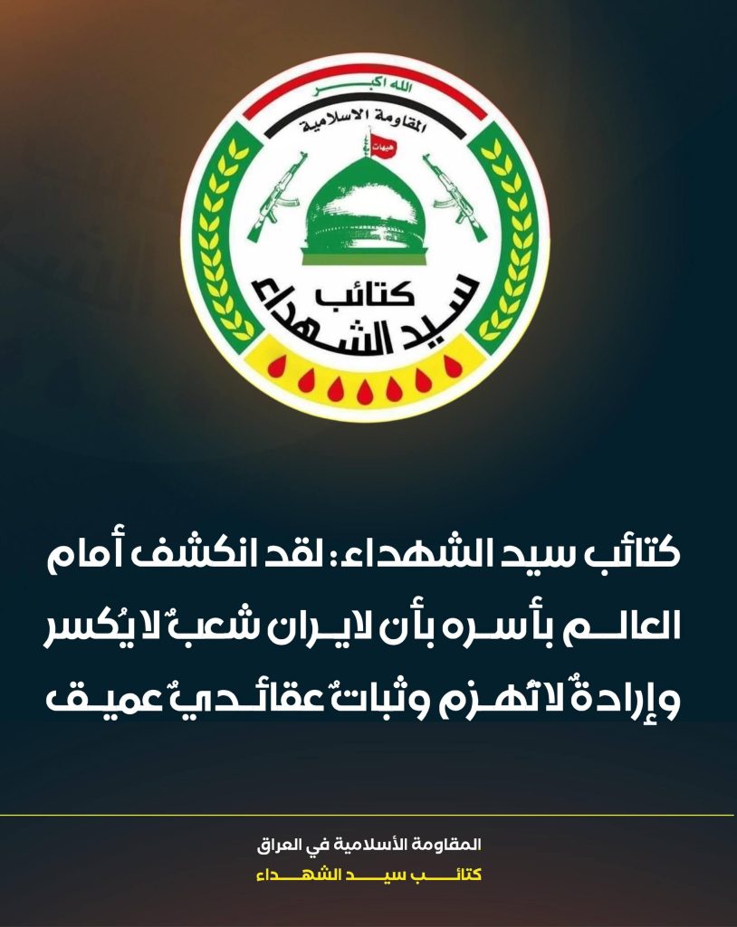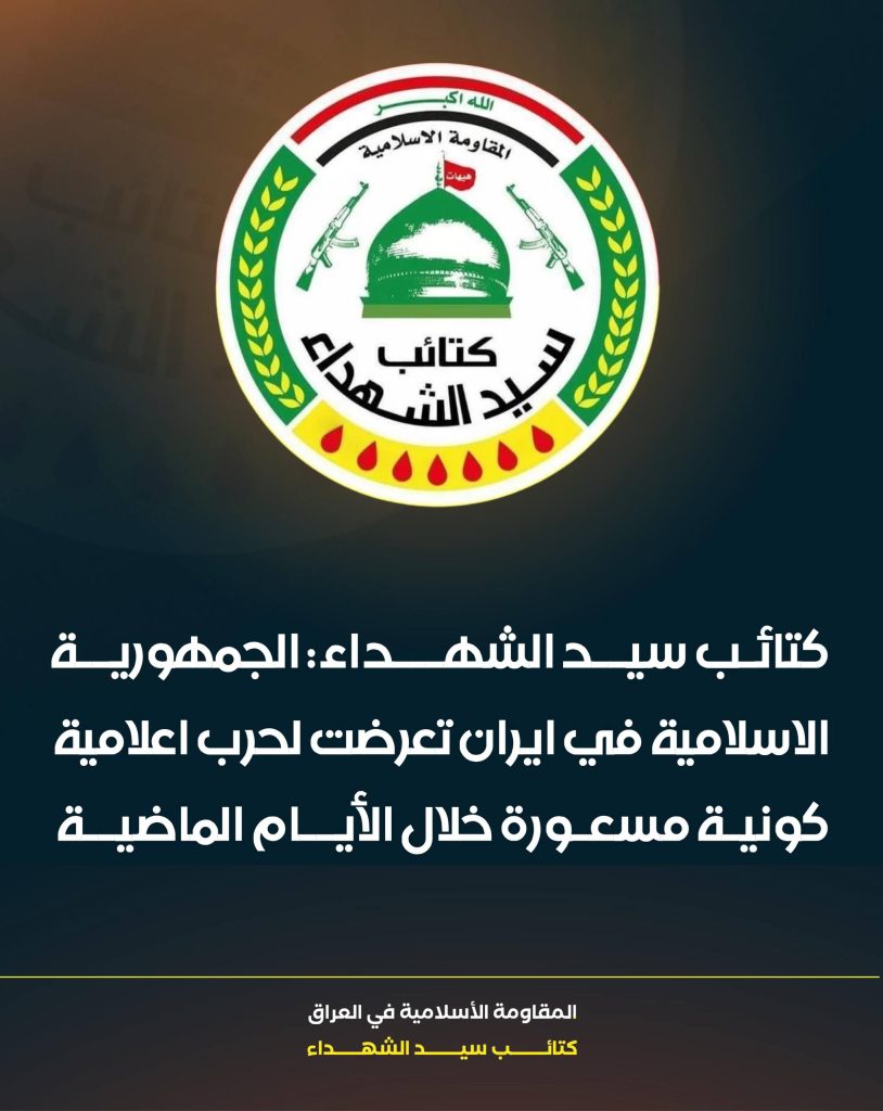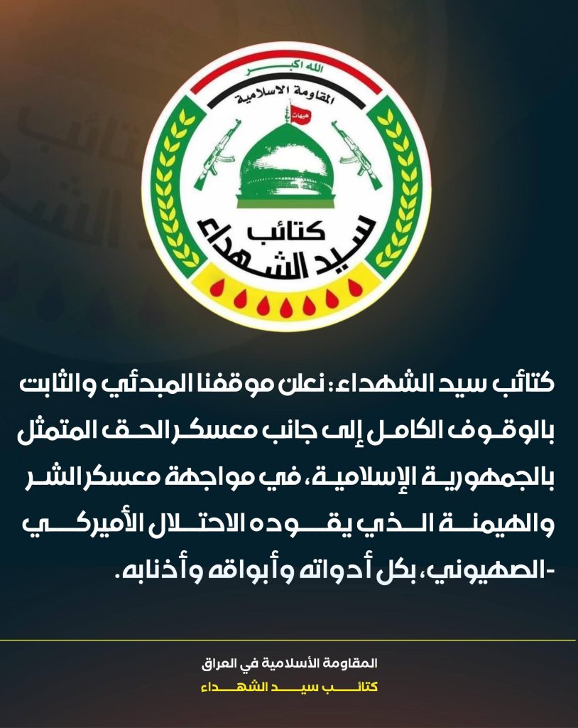 وإننا إذ نعلن موقفنا المبدئي والثابت بالوقوف الكامل إلى جانب معسكر الحق المتمثل بالجمهورية الإسلامية، في مواجهة معسكر الشر والهيمنة الذي يقوده الاحتلال الأميركي-الصهيوني، بكل أدواته وأبواقه وأذنابه، فإننا نحث السلطات العراقية على تحمل مسؤولياتها الوطنية والأخلاقية والقانونية في منع استخدام الأجواء العراقية للاعتداء على دولةٍ جارةٍ مسلمة، وشعبٍ صامدٍ اختار الكرامة طريقاً والسيادة نهجاً.