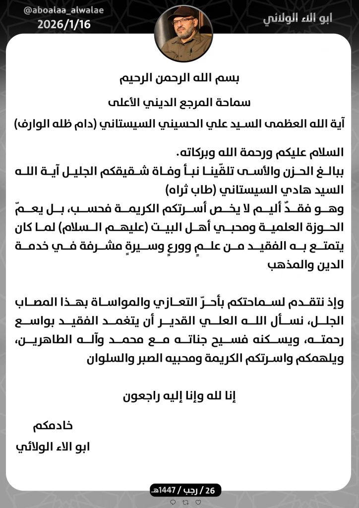 الحاج أبو الاء الولائي يعزي بوفاة شقيق المرجع الإمام السيستاني (دام ظله)