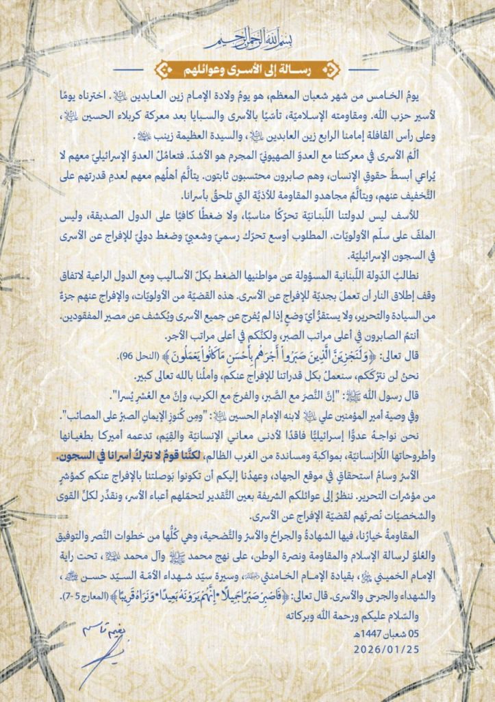 وفيما يلي نص رســـــــالة الأمين العام لحزب الله سماحة الشيخ نعيم قاسم إلى الأســـرى وعوائـلهم