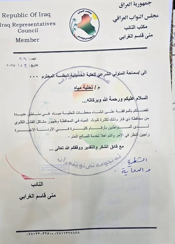 واشارت الغرابي إلى دور العتبة الحسينية والمتولي الشرعي سماحة الشيخ عبد المهدي الكربلائي وموافقته على رفد محافظة ذي قار بمحطات لتحلية المياه عدد ٢،لمعالجة الأزمة الكبيرة في المياه التي تواجهها بعض المناطق في المحافظة.