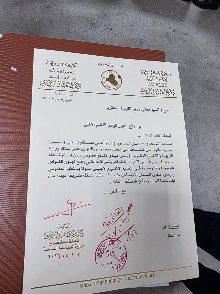 خاطبنا معالي وزير التربية وكالة السيد احمد الاسدي بكتاب رسمي رفع مبالغ اجور الكوادر التربوية والتدريسية اسوتا بالقطاع الحكومي وسنكمل الاجراءات القانونية والسعي باصدار قرار حكومي دعما للكوادر التربوية