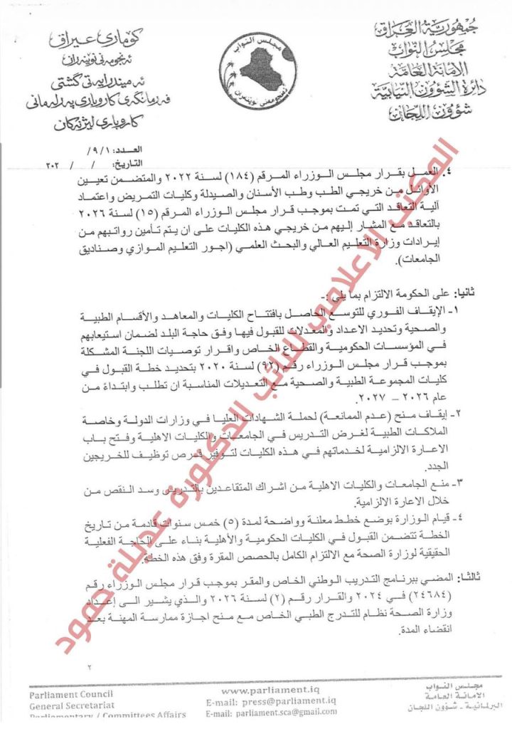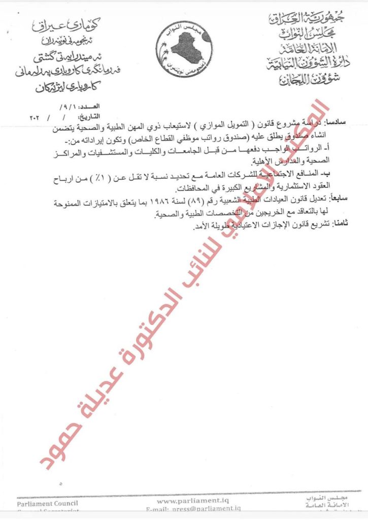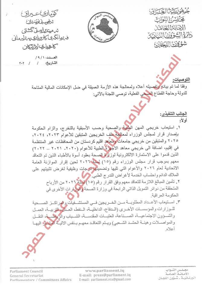 بالوثائق.. النائب عن كتلة منتصرون عديلة حمود: مجلس النواب العراقي يحيل توصيات لجنة خريجي المهن الطبية والصحية إلى مكتب رئيس مجلس الوزراء للتنفيذ والمتابعة
