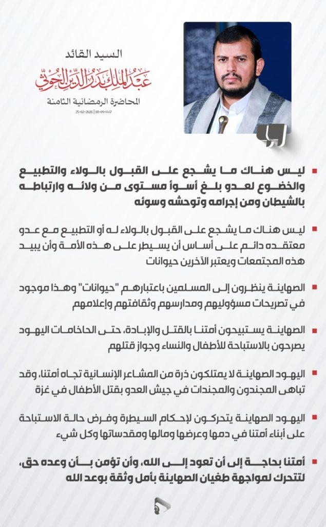 ليس هناك ما يشجع على القبول بالولاء والتطبيع والخضوع لعدو بلغ أسوأ مستوى من ولائه وارتباطه بالشيطان ومن إجرامه وتوحشه وسوئه