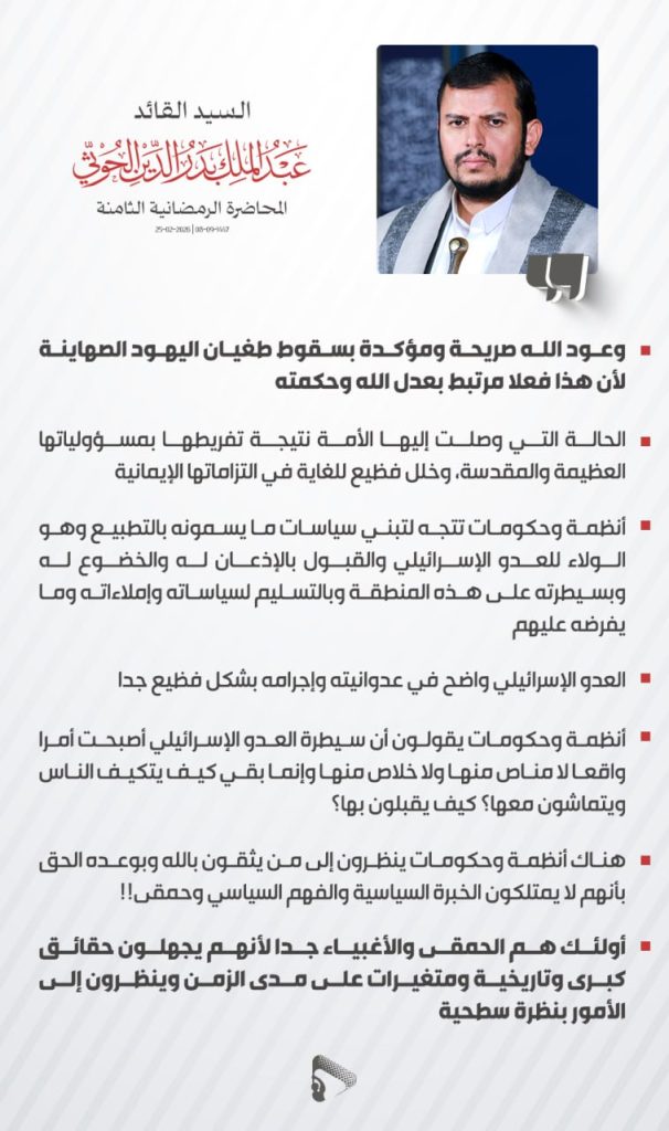 على أمتنا أن تعي بأن الله سيحقق وعده وسيسقط الطغيان الصهيوني، ولكن على هذه الأمة التزامات عملية وإيمانية