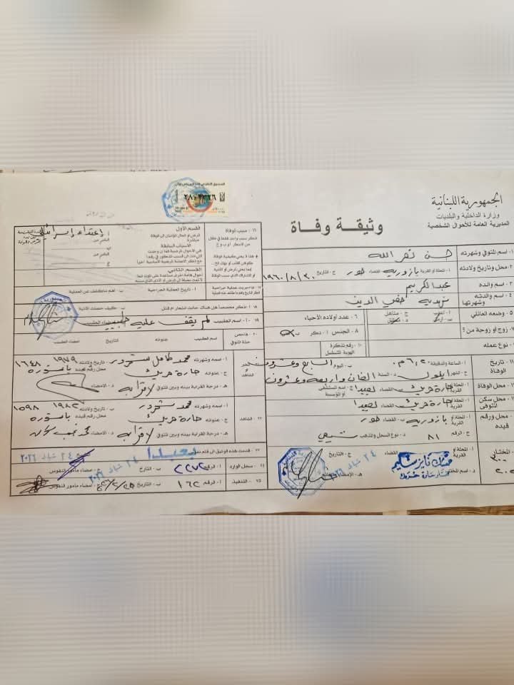 انتشرت على مواقع التواصل الاجتماعي، وثيقة وفاة الأمين العام لحزب الله السابق الشهيد السيد حسن نصرالله، وقد صدرت بتاريخ 24 شباط 2026 بتوقيع مختار بلدة حارة حريك في الضاحية الجنوبية لمدينة بيروت.