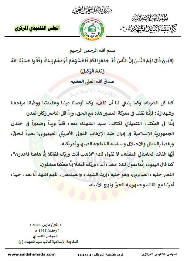 بيان صادر عن المقاومة الاسلاميةكتائب سيد الشهداء بشأن العدوان الصهيو-أمريكي على الجمهورية الاسلامية في ايران