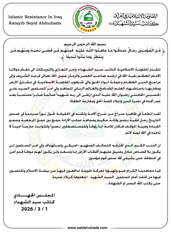المجلس العسكري لكتائب سيد الشهداء: هبو وتهيؤوا لمعركة طويلة تدافعون فيها عن بيضة الاسلام وتقتصون فيها من قتلت أمام المسلمين السيد الشهيد ، اجعلوها كربلاء جديدة