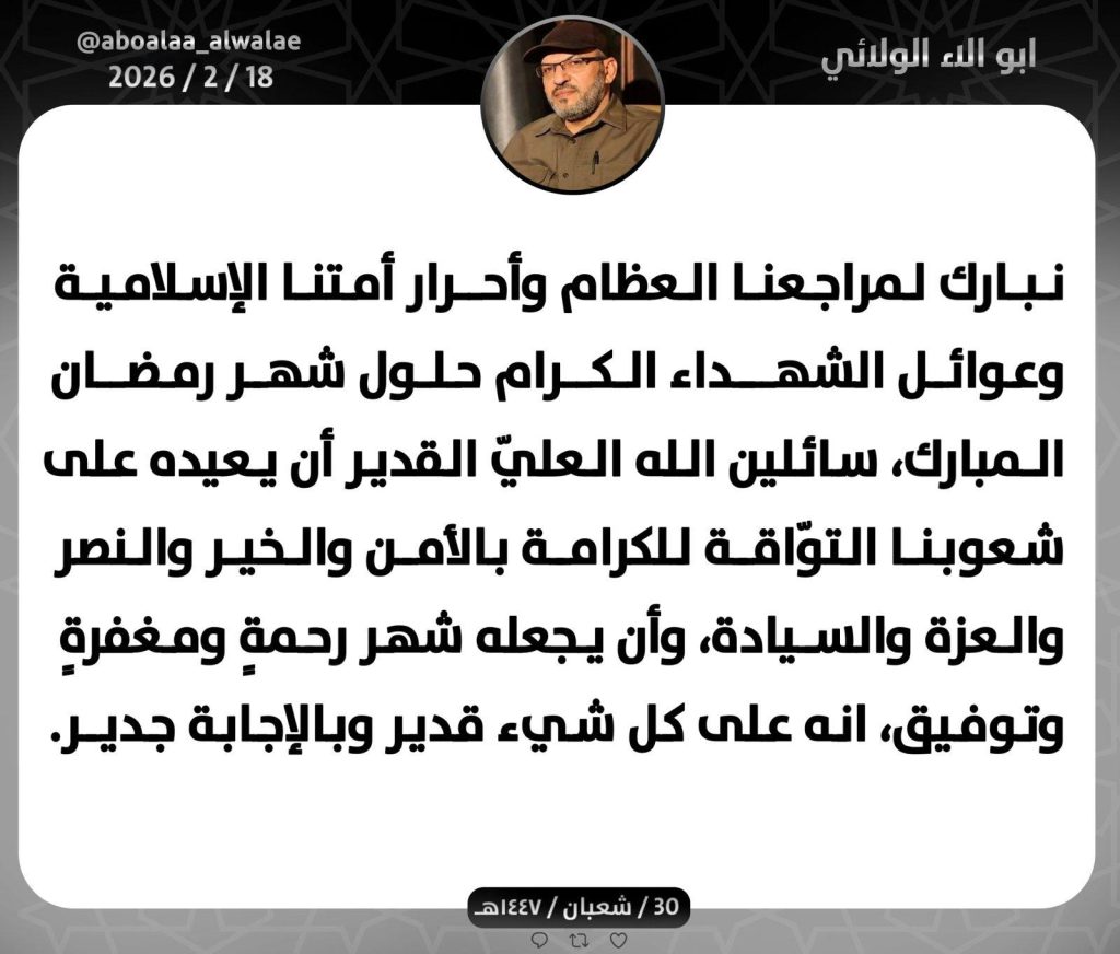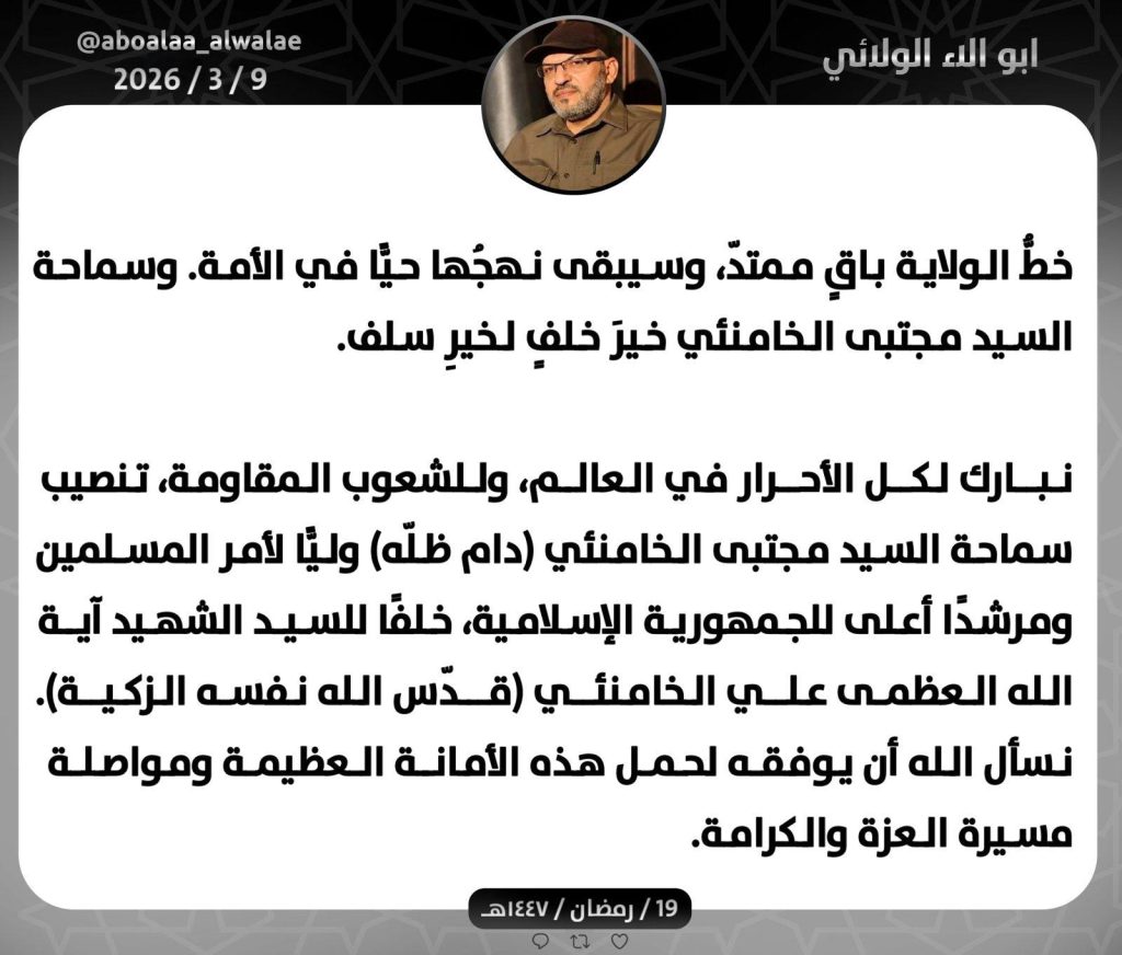 الولائي: نبارك للأحرار في العالم وللشعوب المقاومة تنصيب السيد مجتبى الخامنئي وليا ومرشدا للجمهورية الإسلامية