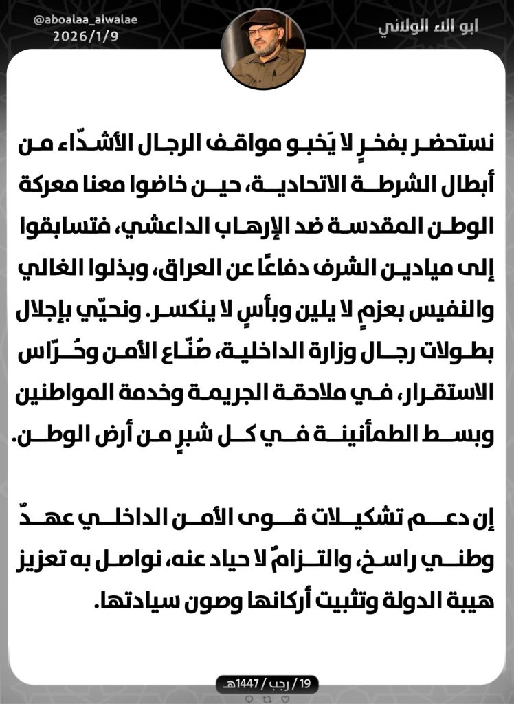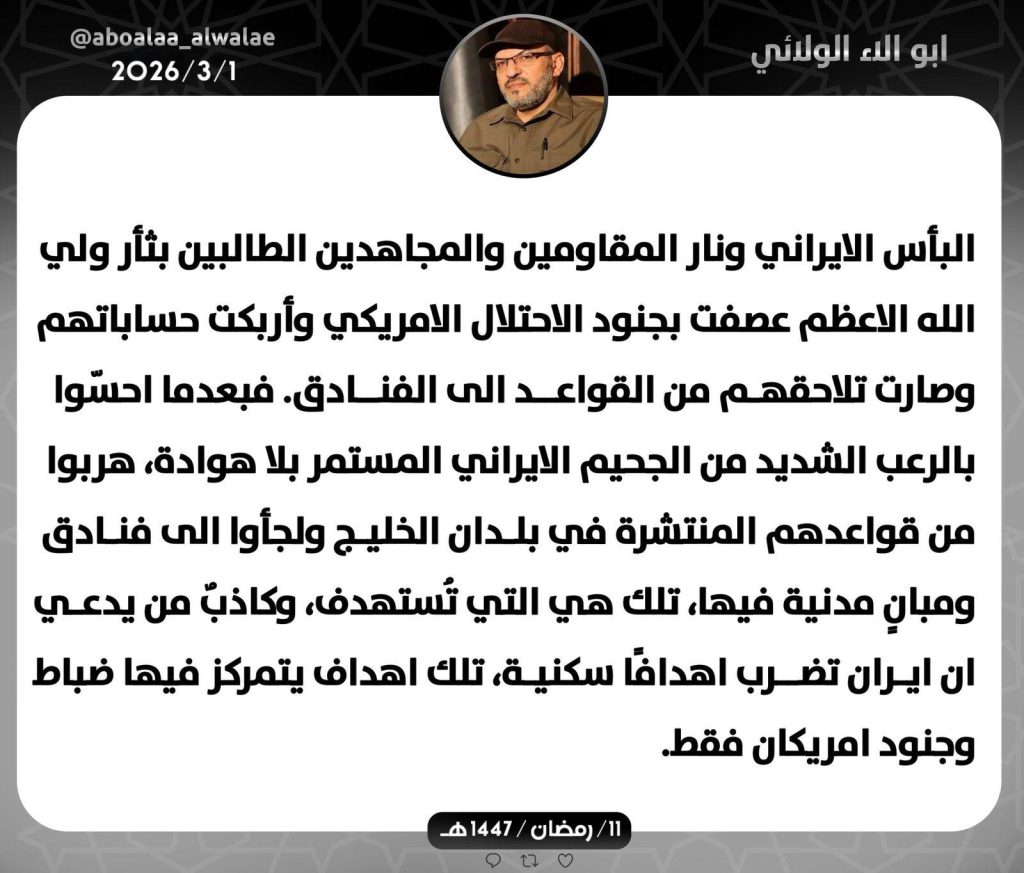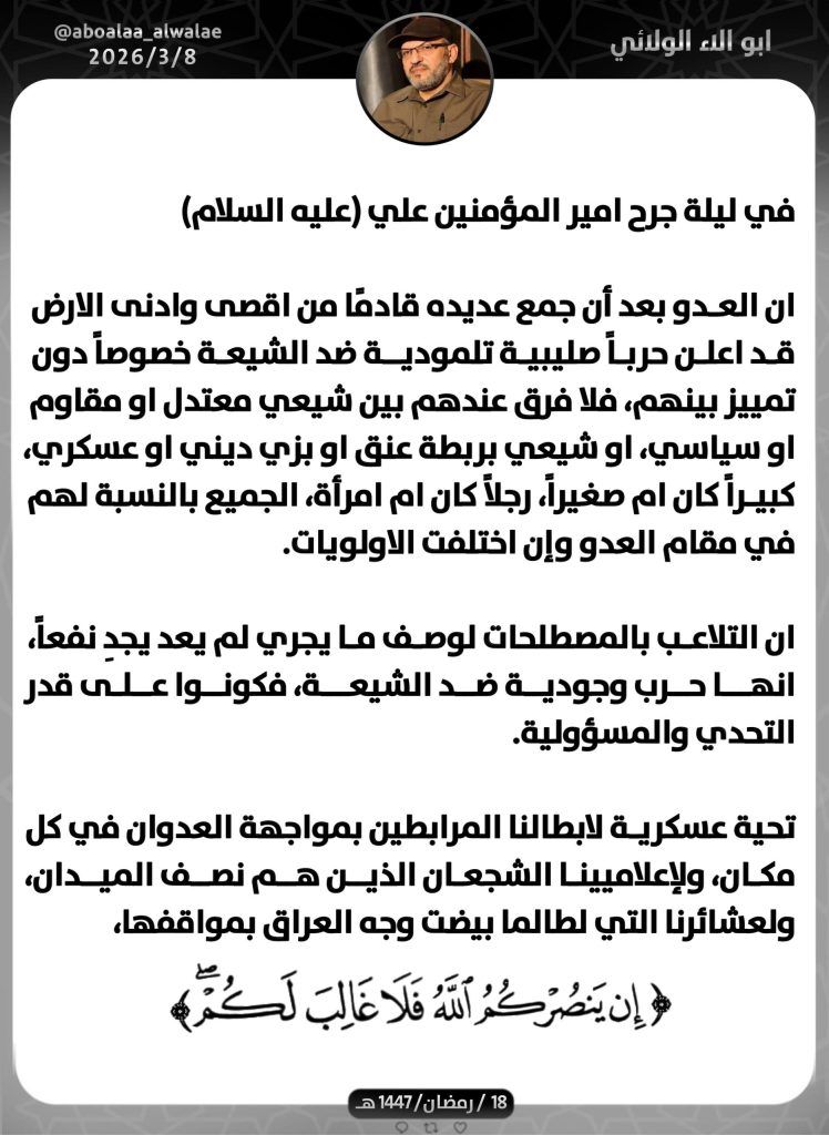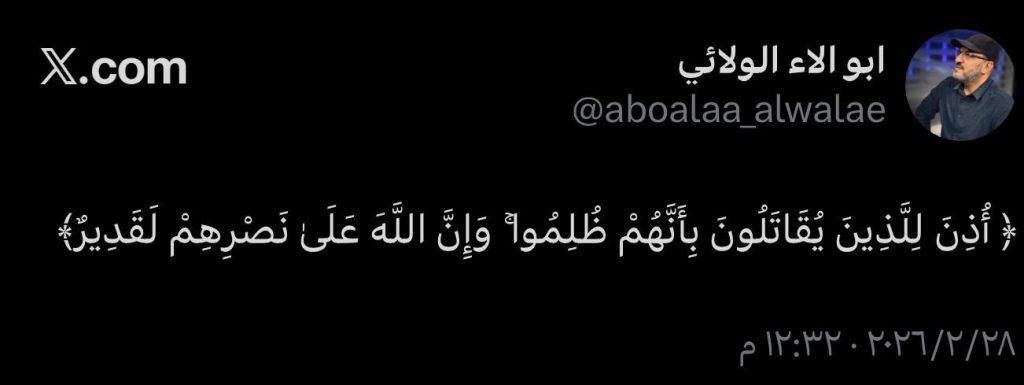 الحاج أبو الاء الولائي مغردا نصرة للجمهورية الاسلامية بقيادة الإمام الخامنئي (دام نصره)