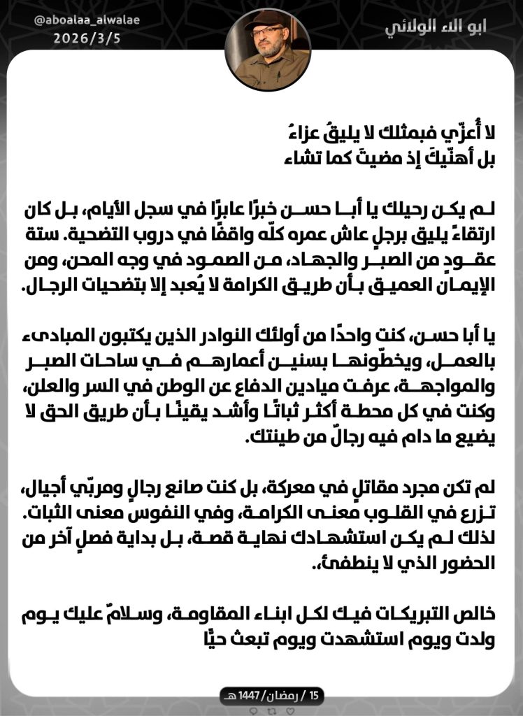 مداد الوصل والعهد على مواصلة الدرب.. رسالة الحاج الامين أبو آلاء الولائي مع قرب تشييع شهيد الاسلام السيد حسن نصر الله