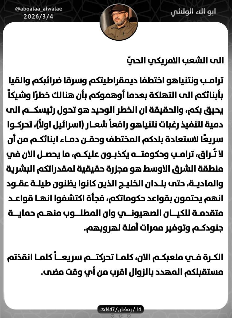الحاج ابو الاء الولائي يوجه رسالة الى الشعب الامريكي