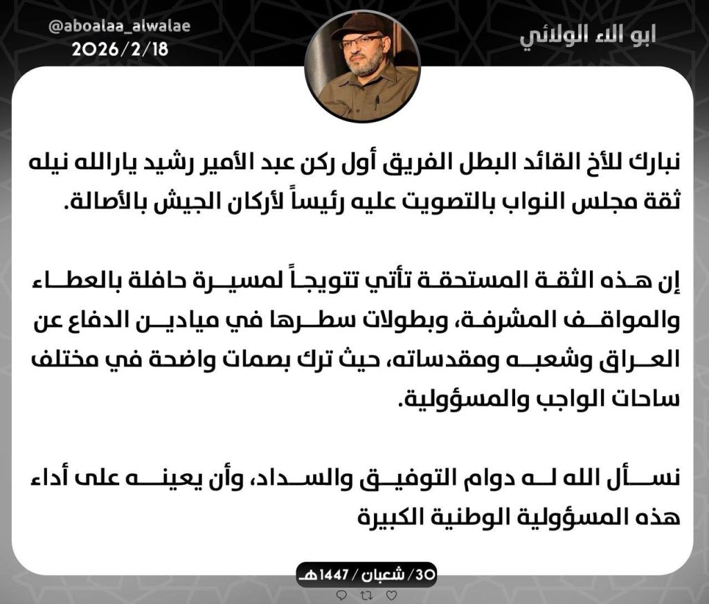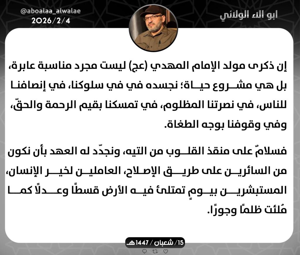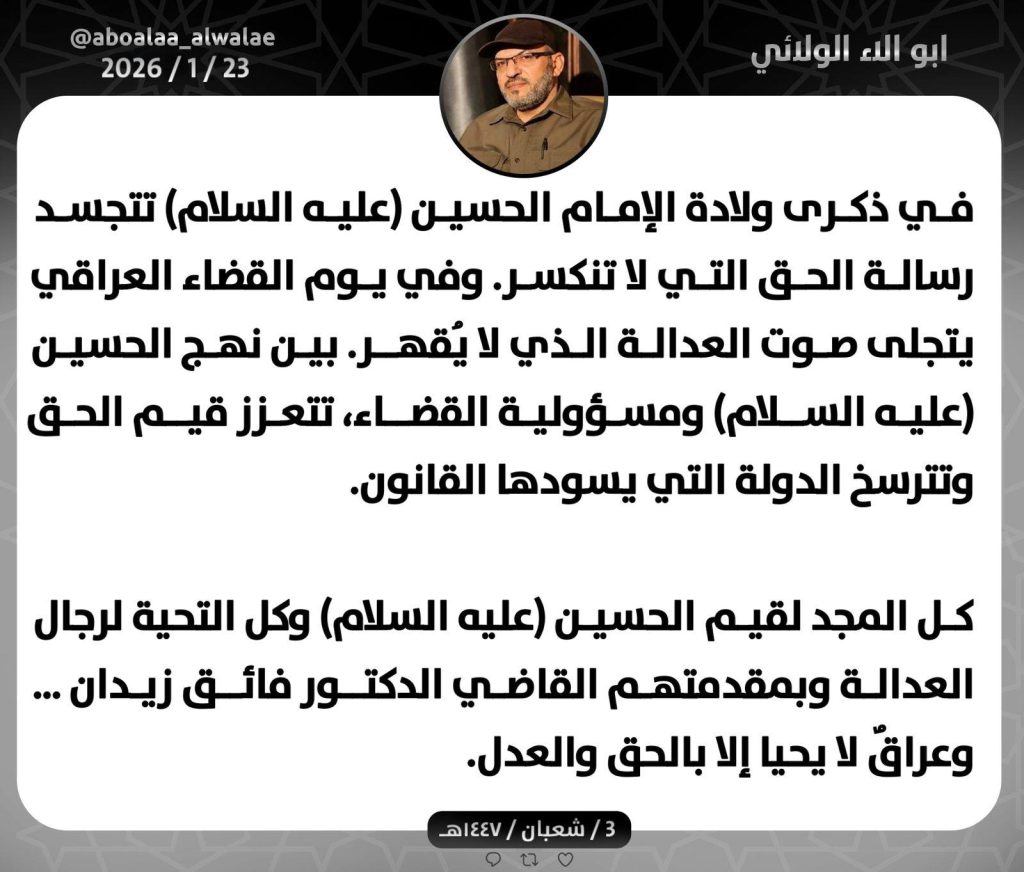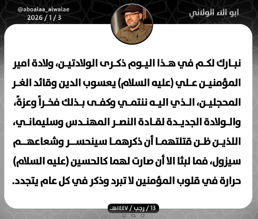 الحاج أبو الاء الولائي يهنئ بذكرى ولادة أمير المؤمنين(ع) وولادة جديدة لقادة النصر (رض)