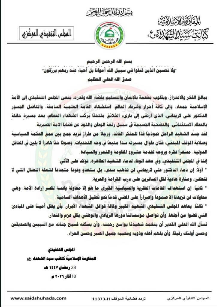 بيان المجلس التنفيذي للمقاومة الإسلامية كتائب سيد الشهداء (ع) حول استشهاد الدكتور علي لاريجاني