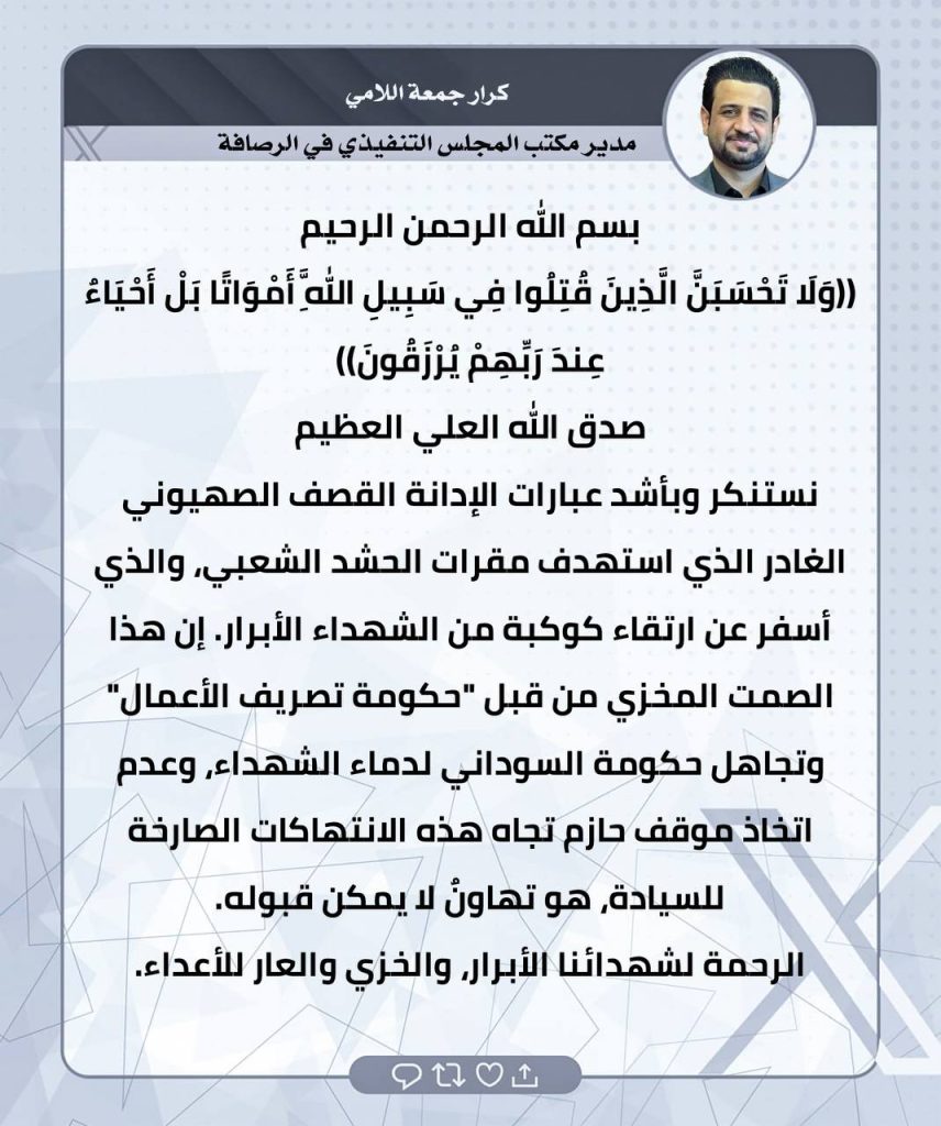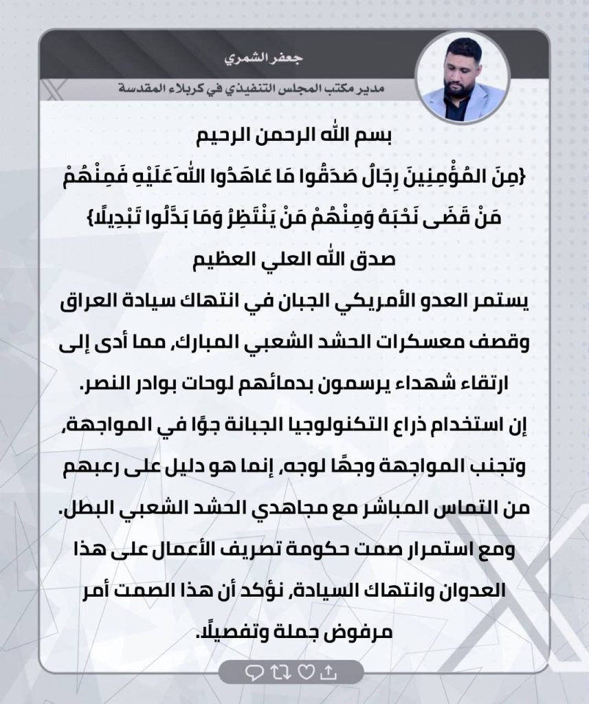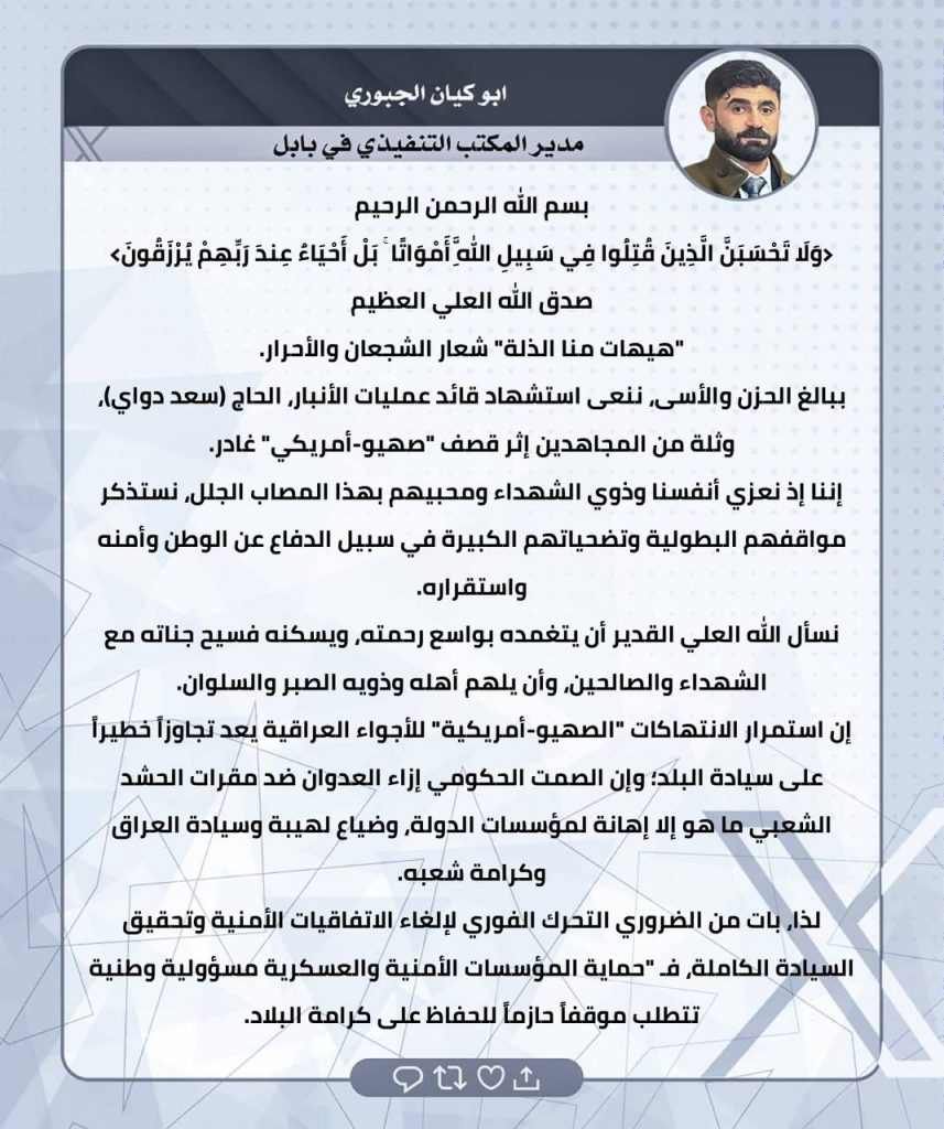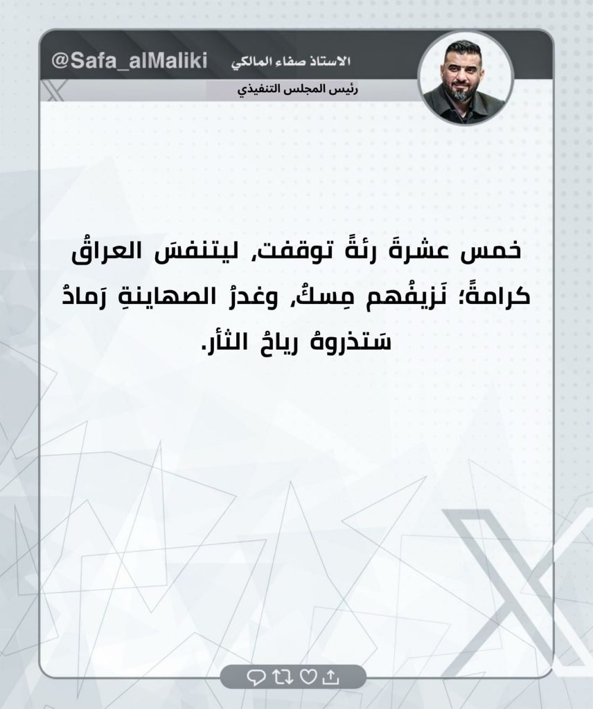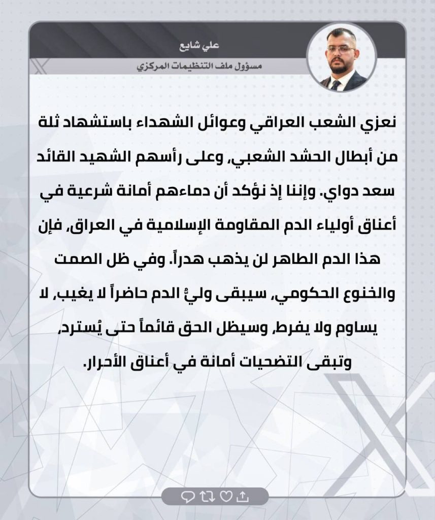 ⚫️لثأرنا… وعدٌ آتٍ.. تغريدات الحاج صفاء المالكي ومدراء المكاتب التنفيذية في المحافظات