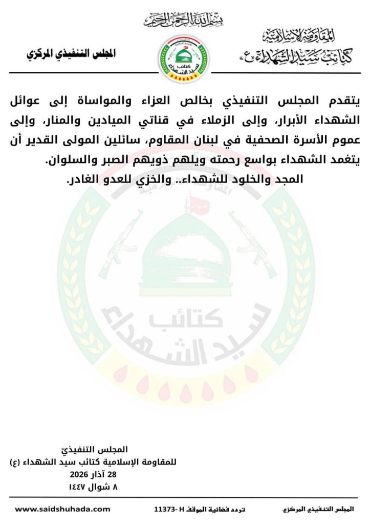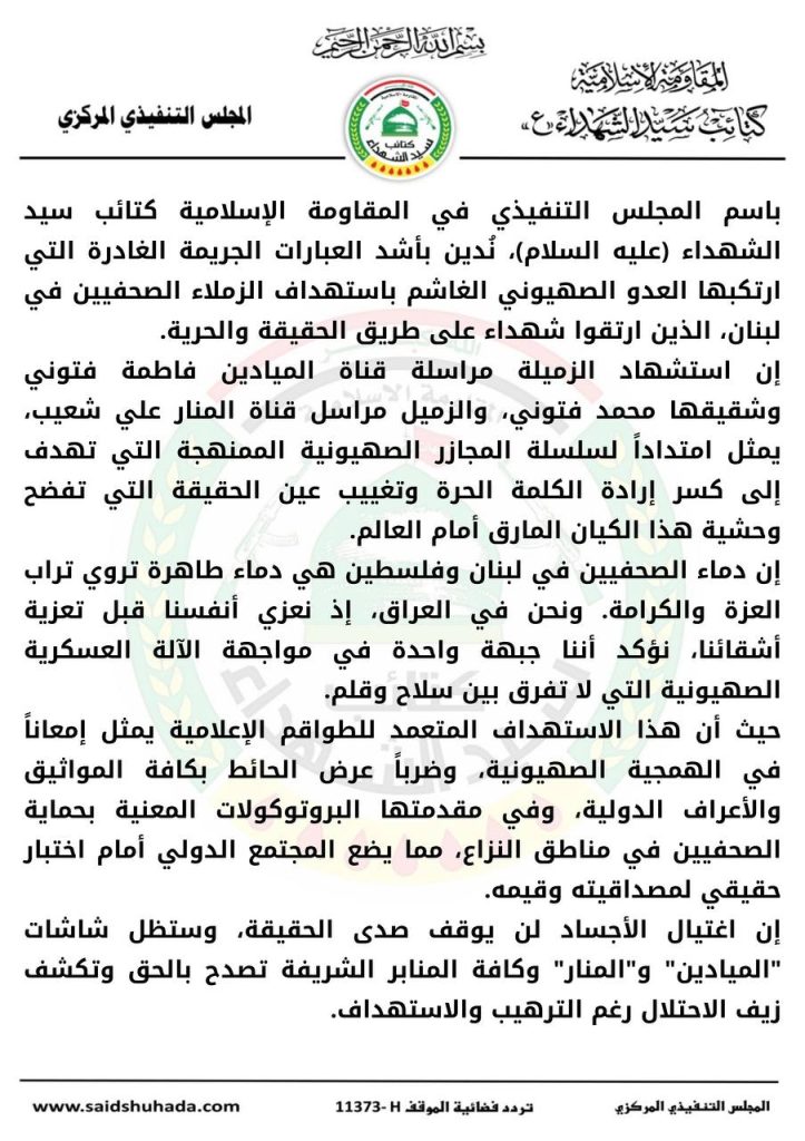 بيان الإعلام الحربي في المقاومة الإسلامية اللبنانية يدين عملية اغتيال شهيدين من قناتي المنار والميادين