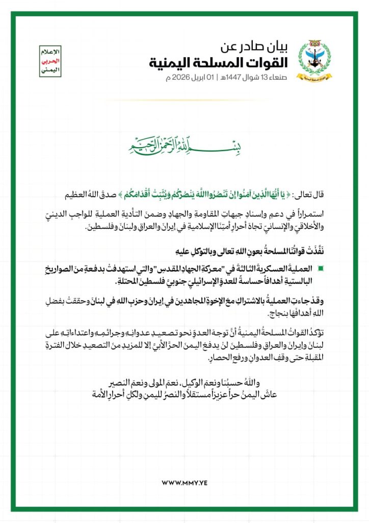 نَفَّذَتْ قواتُنَا المسلحةُ بعونِ اللهِ تعالى وبالتوكلِ عليهِ العمليةَ العسكريةَ الثالثةَ في “معركةِ الجهادِ المقدسِ” والتي استهدفتْ بدفعةٍ منَ الصواريخِ البالستيةِ أهدافاً حساسةً للعدوِّ الإسرائيليِّ جنوبيَّ فلسطينَ المحتلةِ.