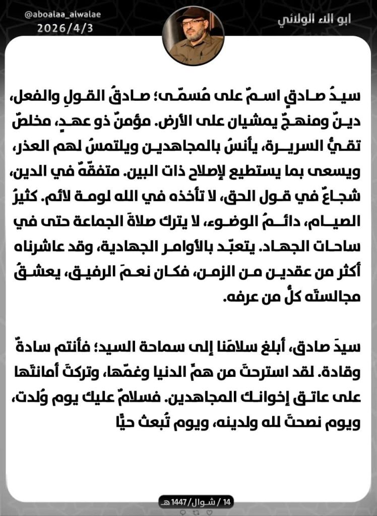 مداد الوصل والعهد على مواصلة الدرب.. رسالة الحاج الامين أبو آلاء الولائي مع قرب تشييع شهيد الاسلام السيد حسن نصر الله