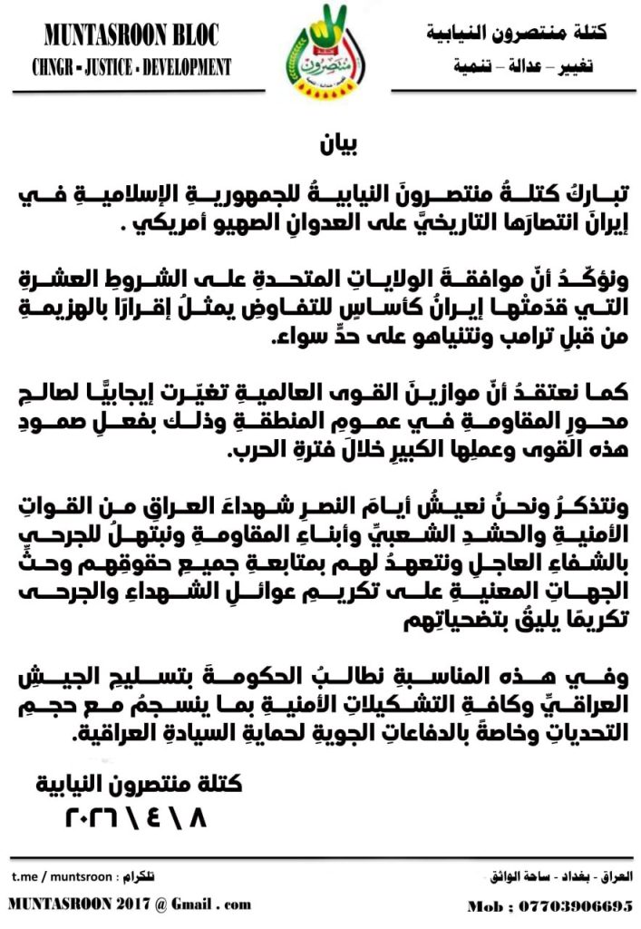 تباركُ كتلةُ منتصرونَ النيابيةُ للجمهوريةِ الإسلاميةِ في إيرانَ انتصارَها التاريخيَّ على العدوانِ الصهيو أمريكي .