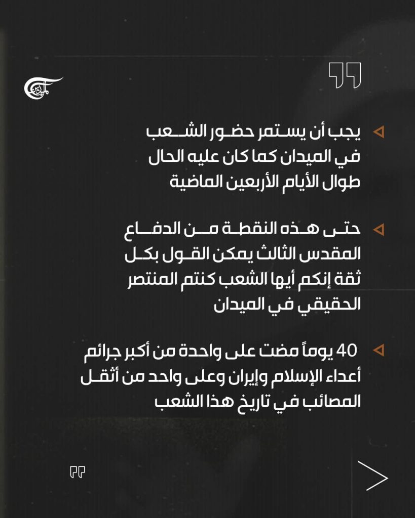 أربعون يومًا مضت على واحدة من أكبر جرائم أعداء الإسلام وإيران، وعلى واحدة من أثقل الفواجع العامة في تاريخ هذا الشعب؛ فاجعة الاستشهاد الأليمة للقائد العظيم للثورة الإسلامية، وأب الشعب الإيراني، وزعيم الأمة الإسلامية، وإمام الباحثين عن الحق في العصر الحاضر، سيد شهداء إيران وجبهة المقاومة، الخامنئي الكبير قدس الله نفسه الزكية.