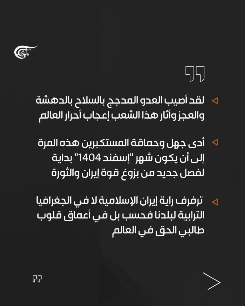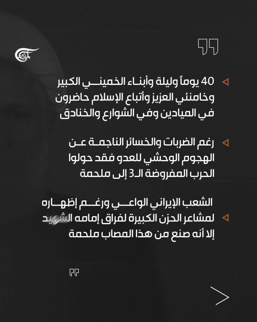 ولكن في المقابل، ومنذ أربعين يومًا وليلة، يتواجد أبناء الخميني الكبير والخامنئي العزيز الغيارى، وأتباع الإسلام المحمدي الأصيل (صلى الله عليه وآله وسلم) باهتمام وشجاعة تضرب بها الأمثال في الميادين والشوارع وخنادق القتال، ورغم الضربات والخسائر الناجمة عن الهجوم الوحشي للعدو، فقد حولوا الحرب المفروضة الثالثة إلى ملحمة للدفاع المقدس الثالث. لقد أثبت الشعب الإيراني الواعي واليقظ أنه وإن كان مفجوعًا برحيل إمامه الشهيد، ولكنه وتأسيًا بالورثة المباشرين لعاشوراء الحسين، صنع من هذا الفقد ملحمة، ومن الرثاء رجزًا؛ وذلك كله أصاب العدو المدجج بالسلاح بالحيرة والاستعجال، وأثار إعجاب أحرار العالم. هذه المرة، تسببت جهالة المستكبرين وحماقتهم في أن يكون شهر آذار من عام 2026 بداية لفصل جديد من بزوغ قوة إيران والثورة الإسلامية واسمهما، ليرفرف علم إيران الإسلام ليس فقط في الجغرافيا الترابية لبلادنا، بل في عمق قلوب طالبي الحق في العالم.