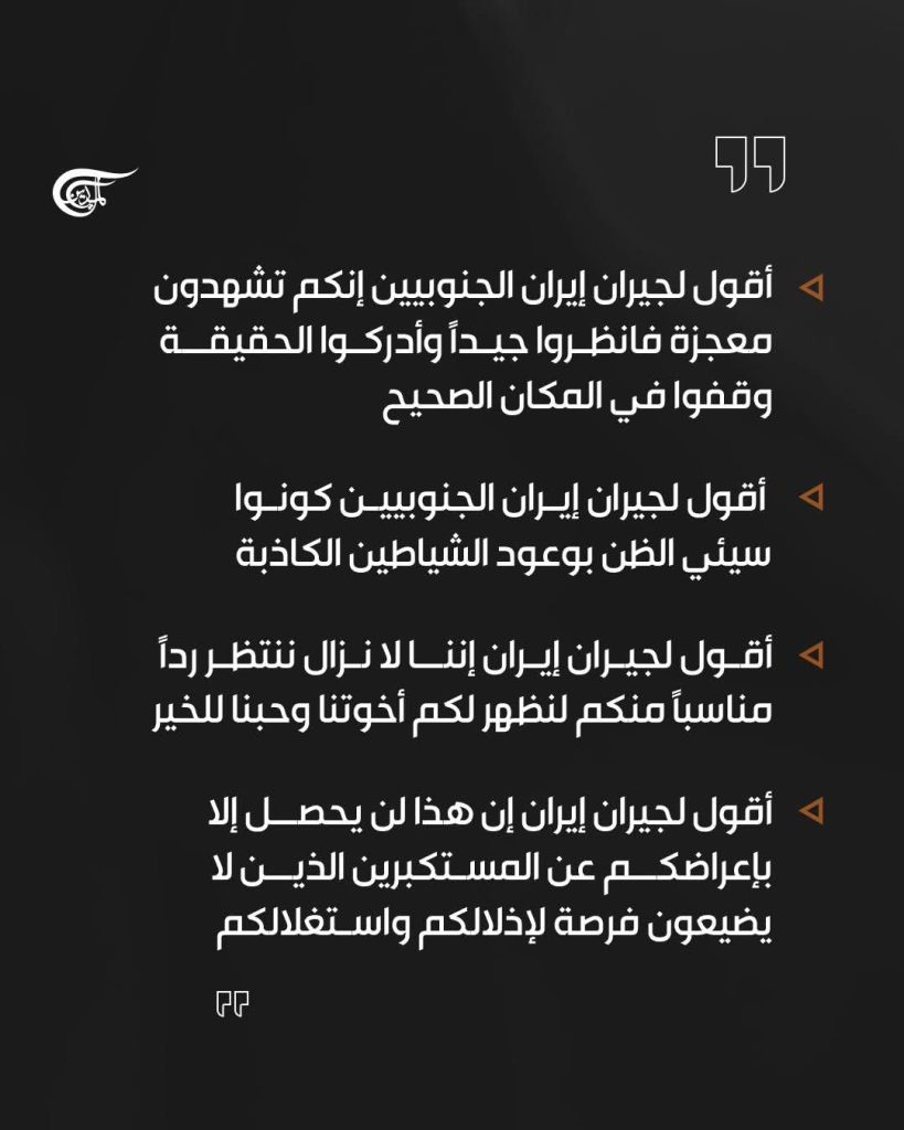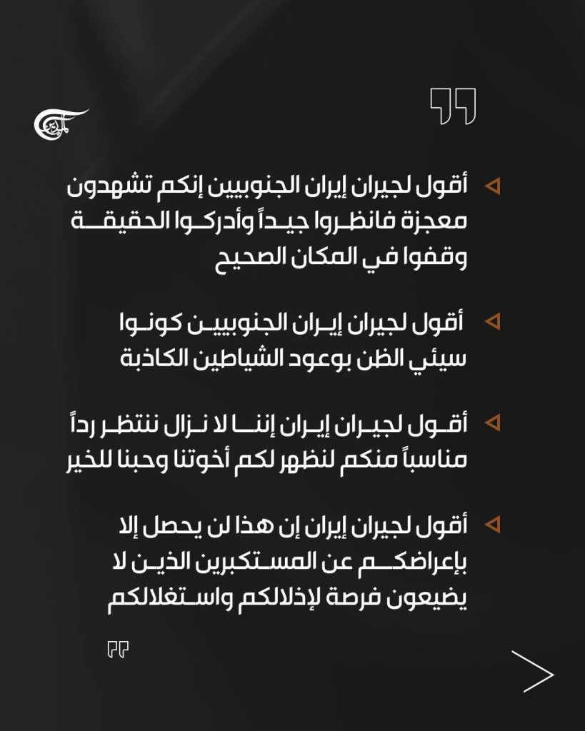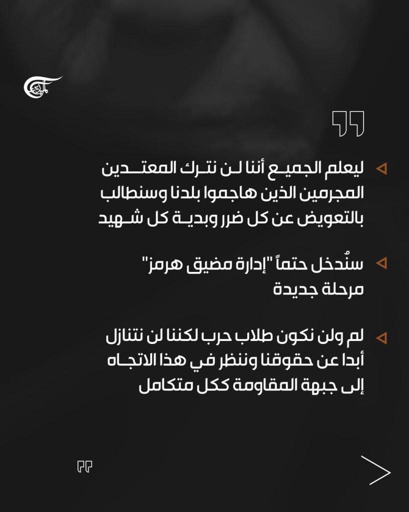 وشدد سماحته على أن أننا “لم نسعَ ولن نسعى للحرب؛ لكننا لن نتنازل عن حقوقنا المشروعة بأي شكل من الأشكال. وفي هذا الصدد نعد جبهة المقاومة بأكملها كيانًا واحدًا”.