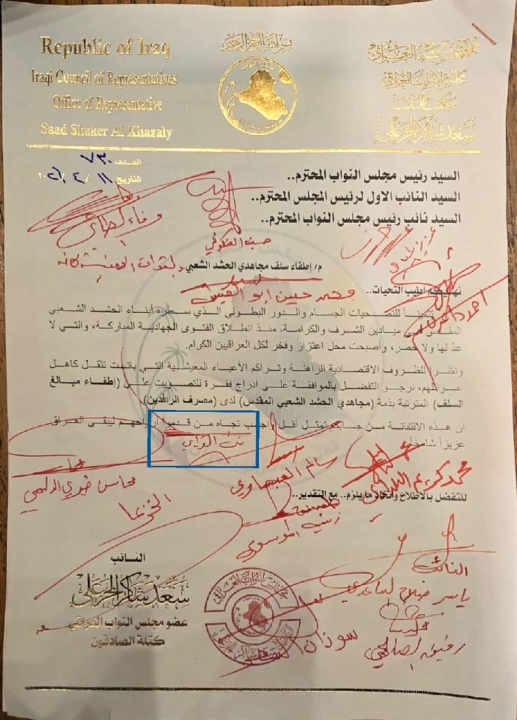انطلاقاً من الشعور بالمسؤولية الوطنية تجاه تضحياتكم التي لا تُقدر بثمن، ومن باب الوفاء للدماء الزكية التي صانت العرض والمقدسات، نؤكد وقوفنا الكامل والداعم للمطالبة بـ إطفاء السلف والقروض المترتبة بذمة مجاهدي الحشد لدى مصرف الرافدين.